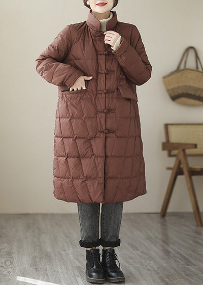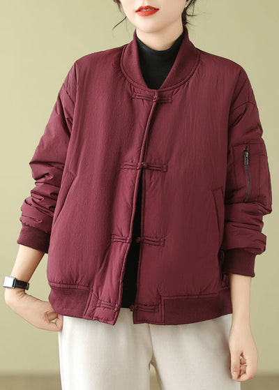 Wine Red Pockets Cotton Filled Parka Stand Collar Long Sleeve