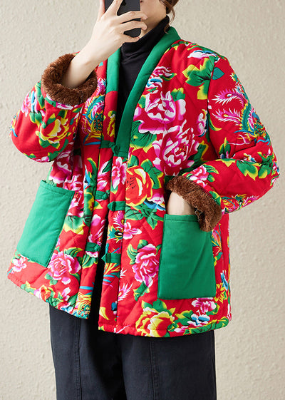 Italian Red Print Button Patchwork Warm Fleece Hoodies Coats Winter