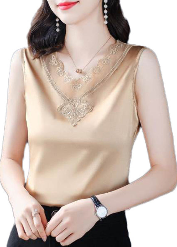 French Black V Neck Tulle Patchwork Silk Vests Summer