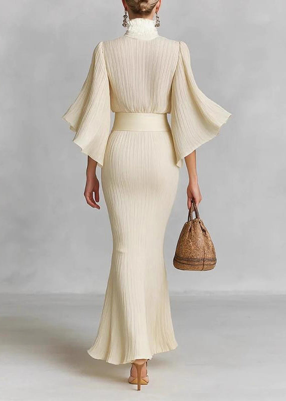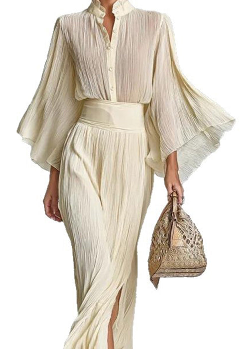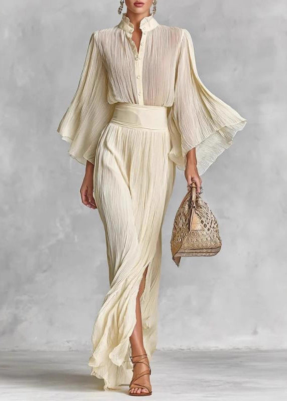 Stylish Beige Ruffled Side Open Shirts And Skirts Cotton Two Pieces Set Spring