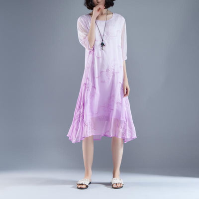 boutique linen sundress oversized Linen Round Neck Three Quarter Sleeve Pink Pleated Dress