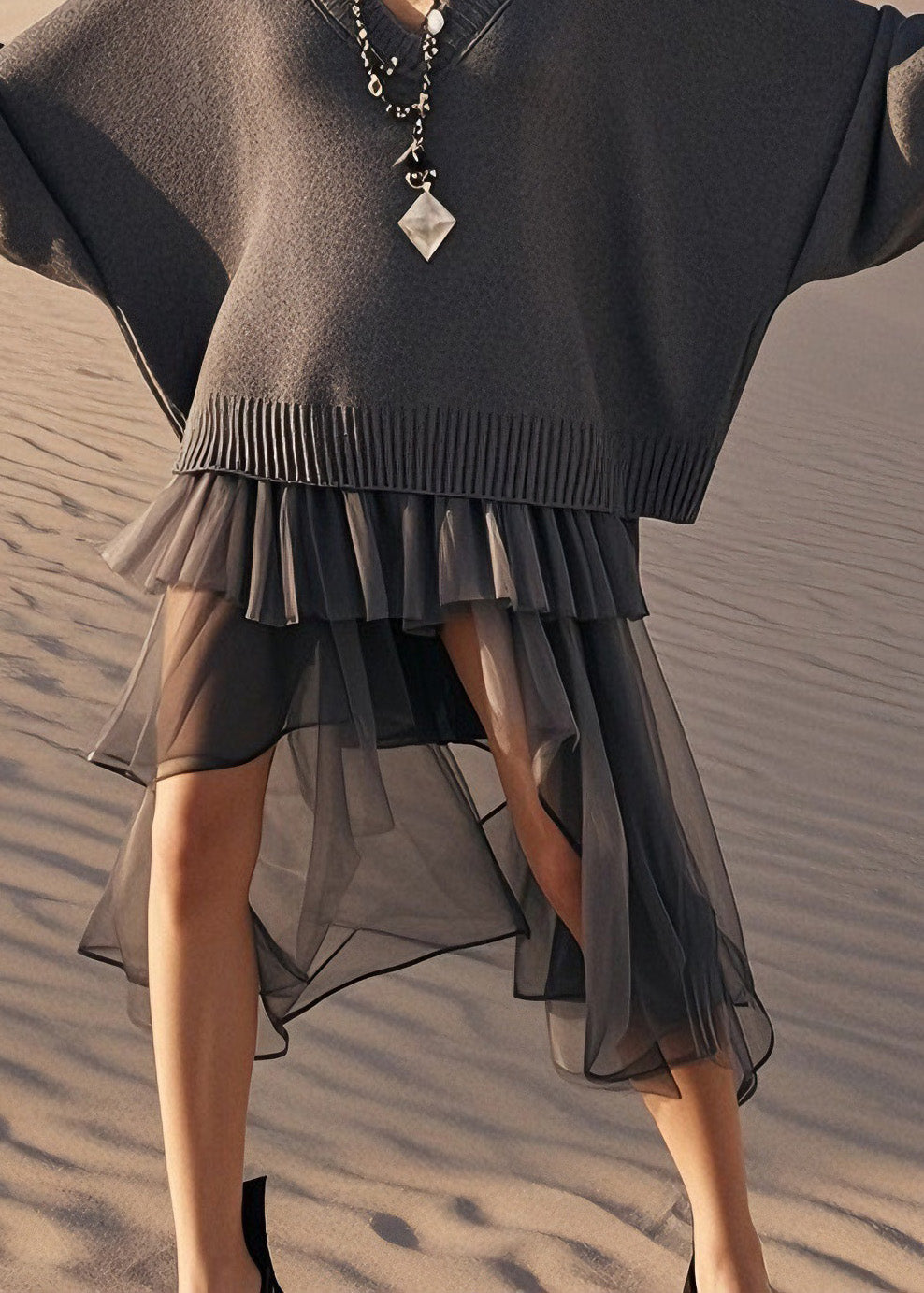 Chic Grey V Neck Tulle Wrinkled Patchwork Knit Sweater Dress Spring