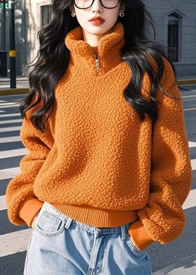 Women Orange Stand Collar Zip Up Solid Fluffy Sweatshirt Winter