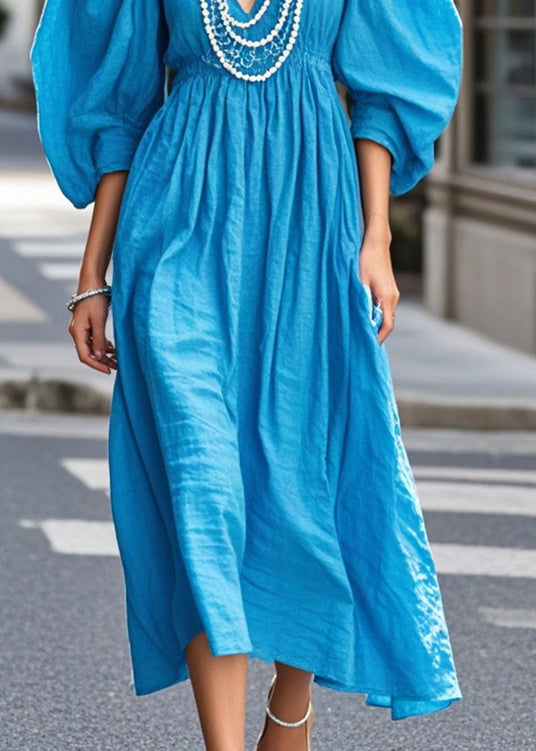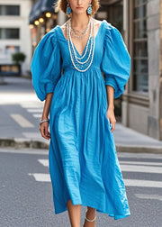Chic Blue Cotton Holiday Dress V Neck Puff Sleeve