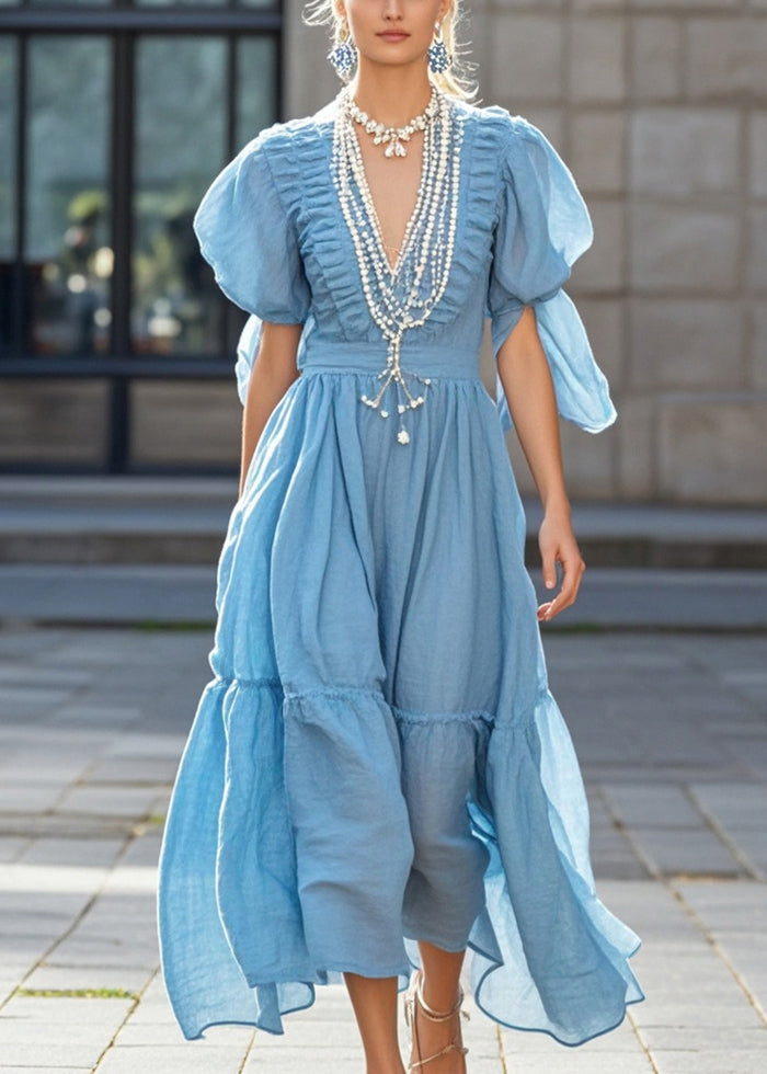 Chic Sky Blue Puff Sleeve Nail Bead Cotton Long Dress