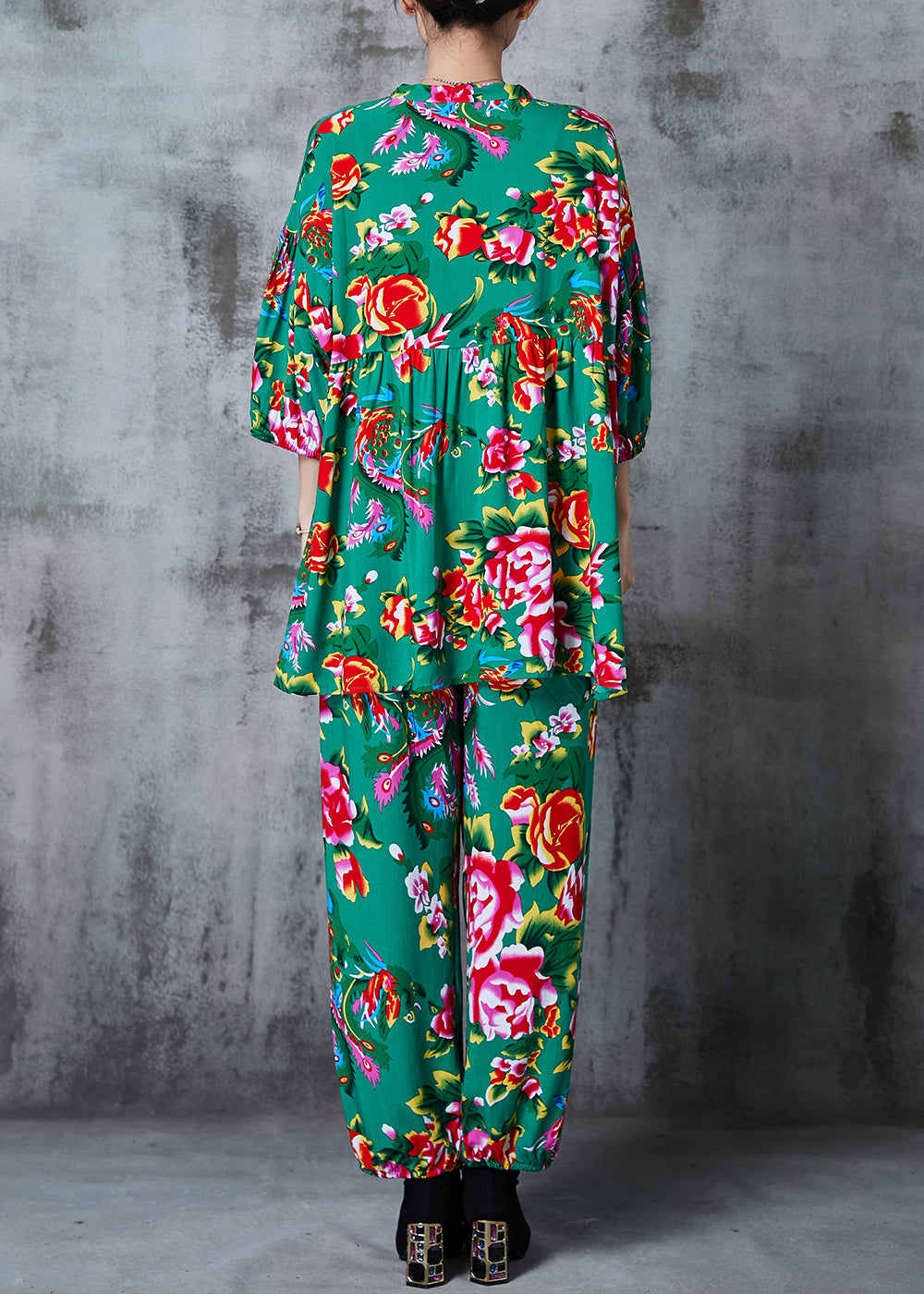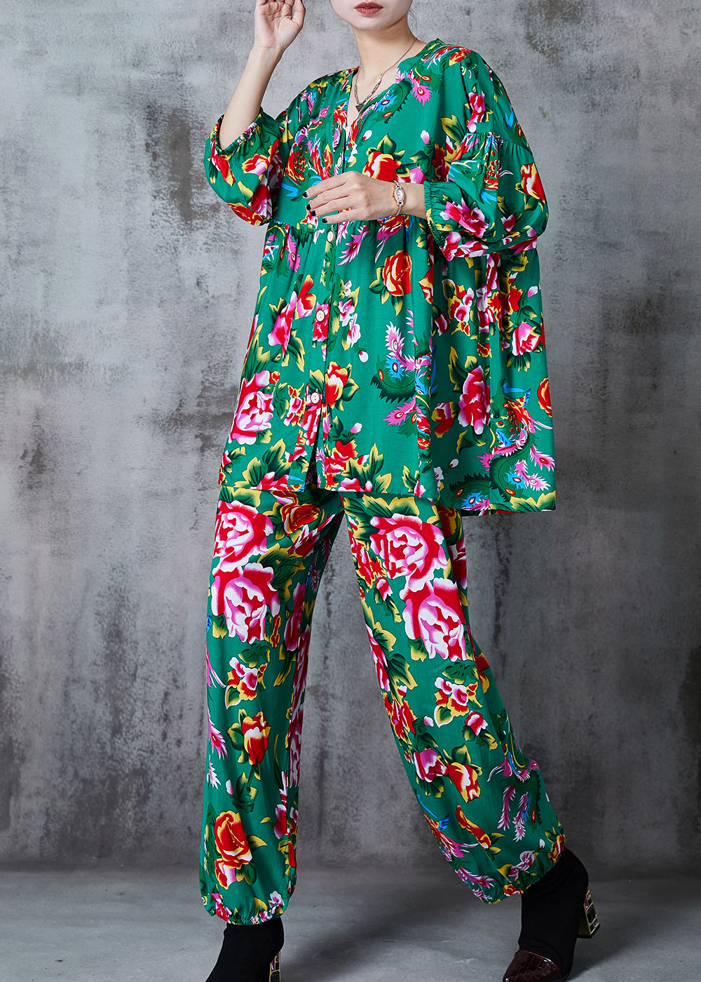 Green Print Cotton Retro Two-Piece Set Oversized Summer