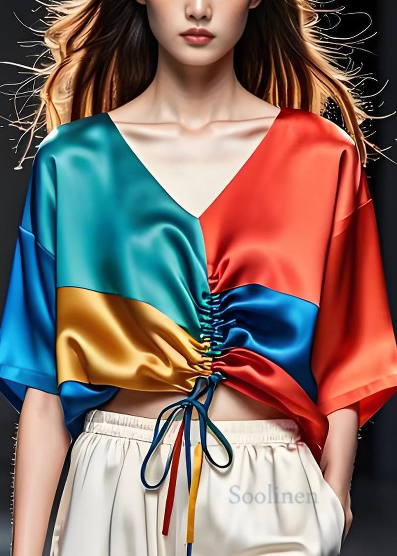 Fashion Colorblock V Neck Cinched Silk Blouses Summer