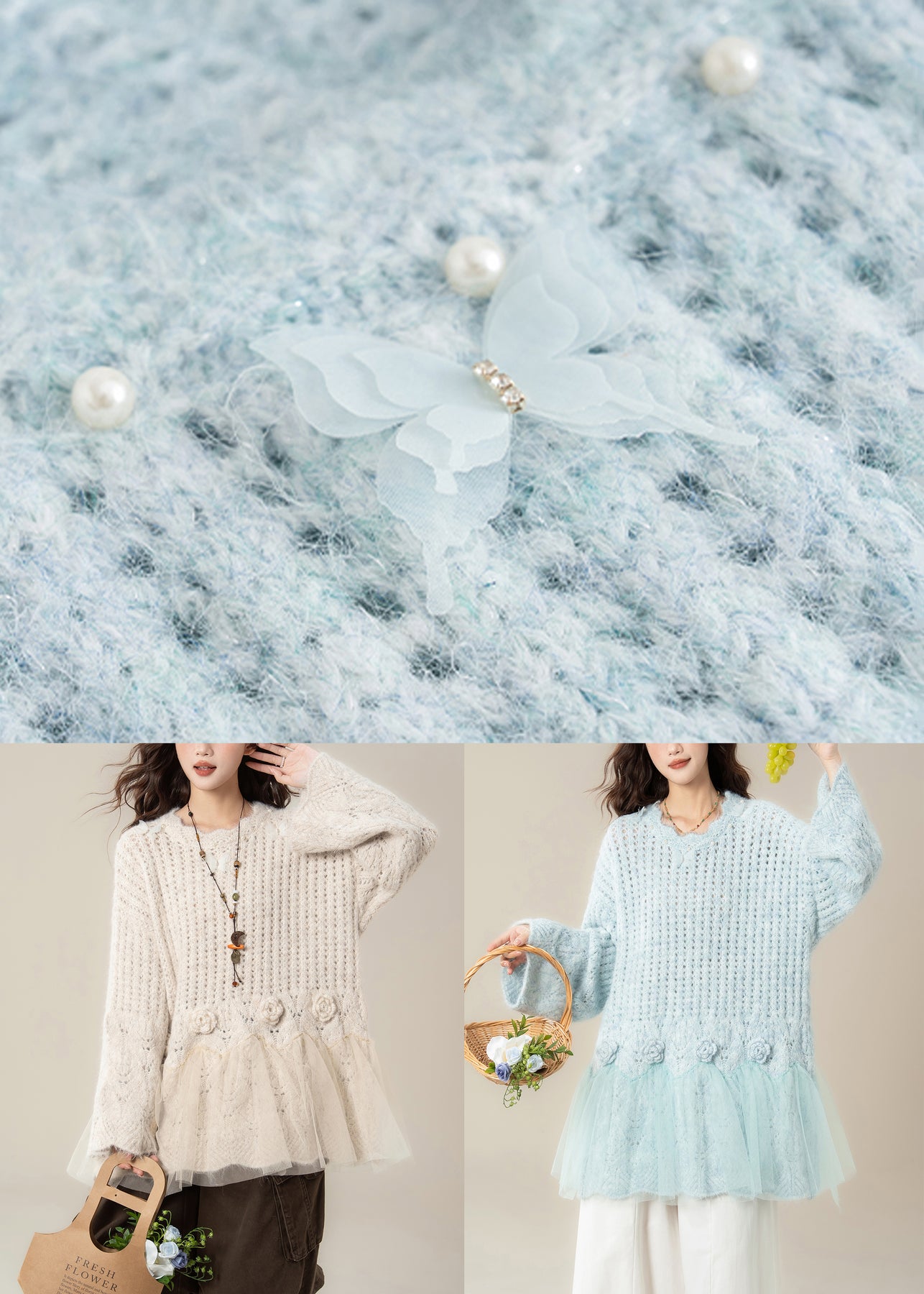 Chic Light Blue Hollow Out Butterfly Tulle Patchwork Knit Sweater Spring