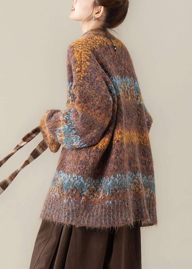 Coffee Striped Button Cozy Patchwork Knit Coat V Neck