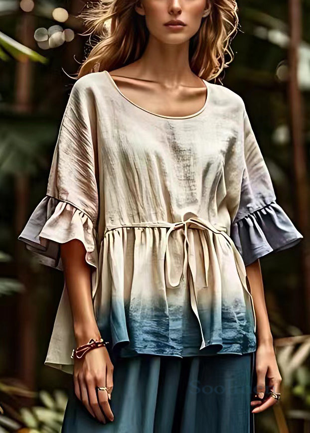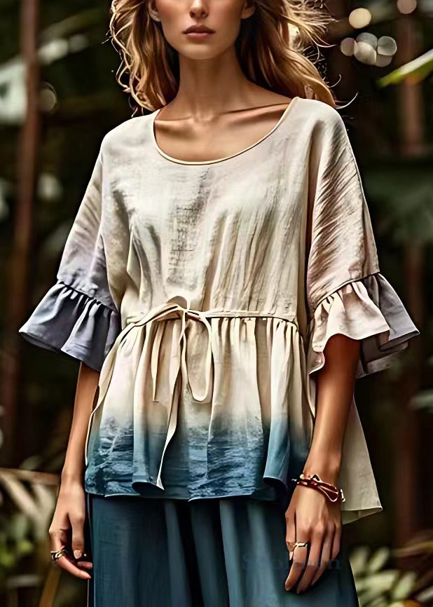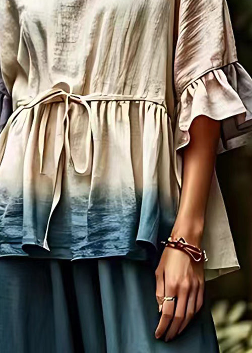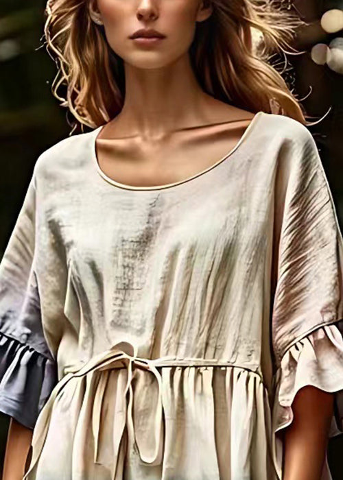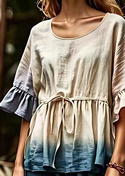 Art Beige O Neck Lace Up Cotton Blouse Half Sleeve