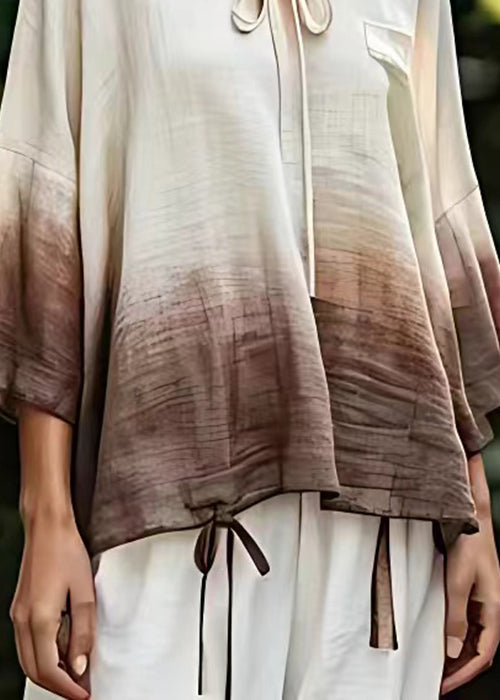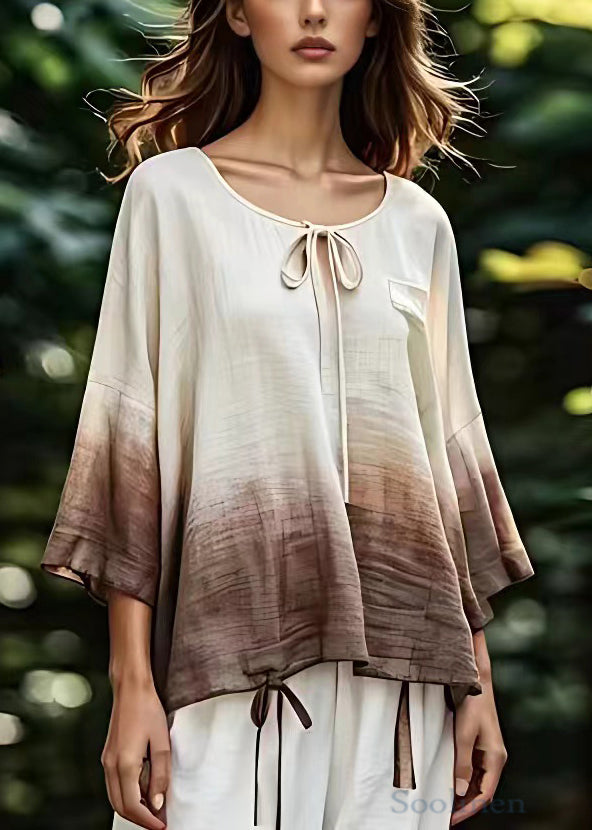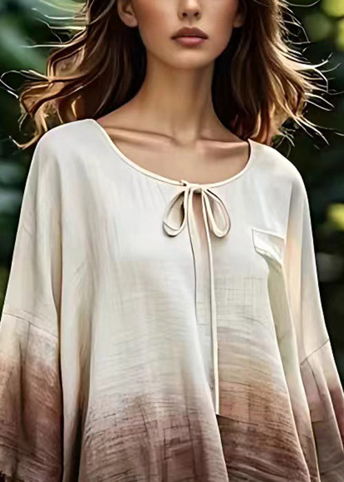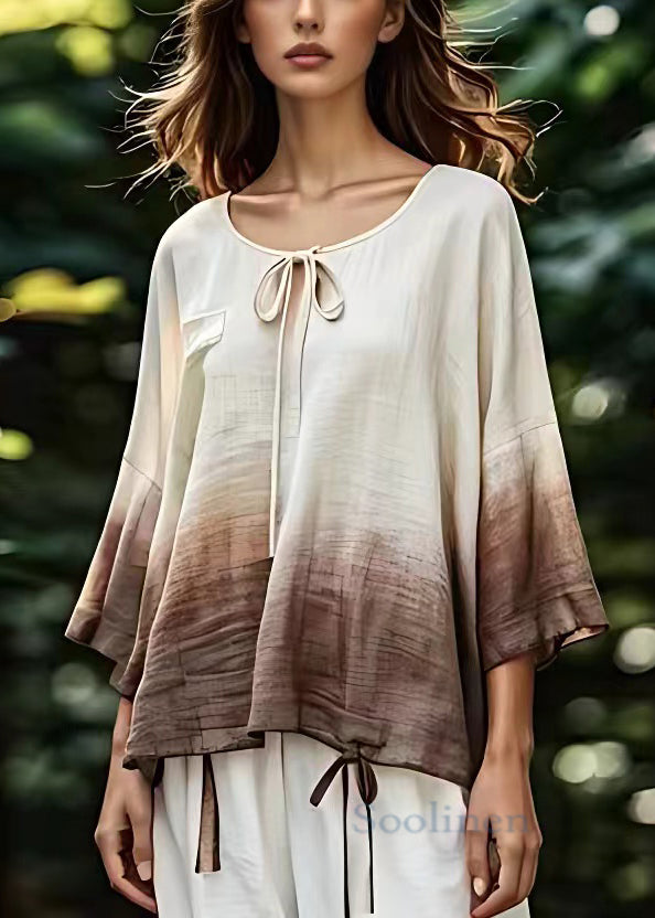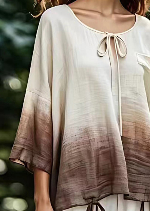 Elegant Beige O Neck Lace Up Cotton Tops Bracelet Sleeve