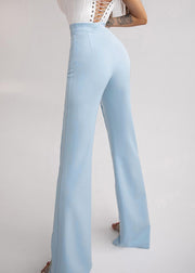 Women Blue Hollow Out Patchwork Tulle Bell-bottom Trousers Spring
