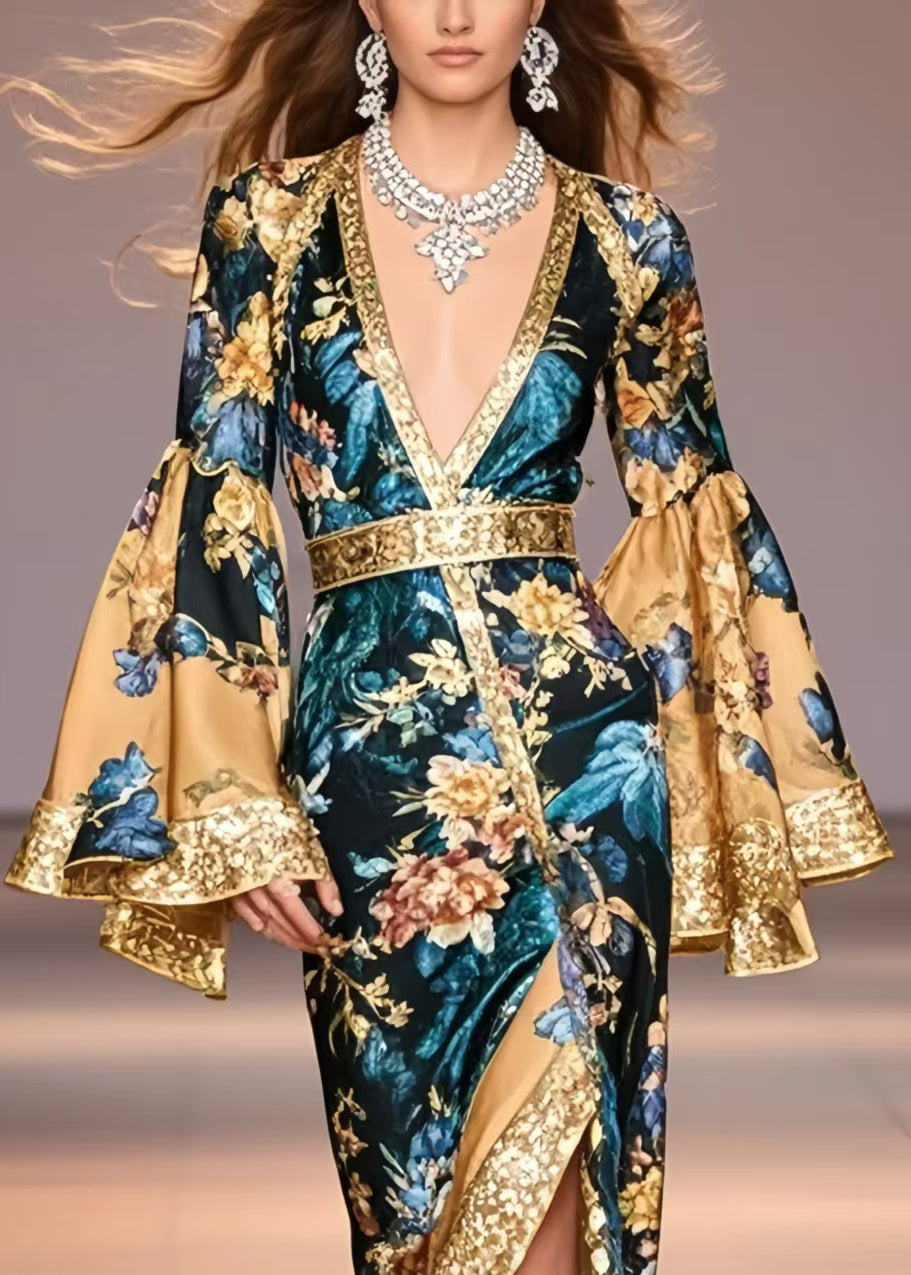 Elegant Black Print Side Open Chiffon Wraped Dress Flare Sleeve