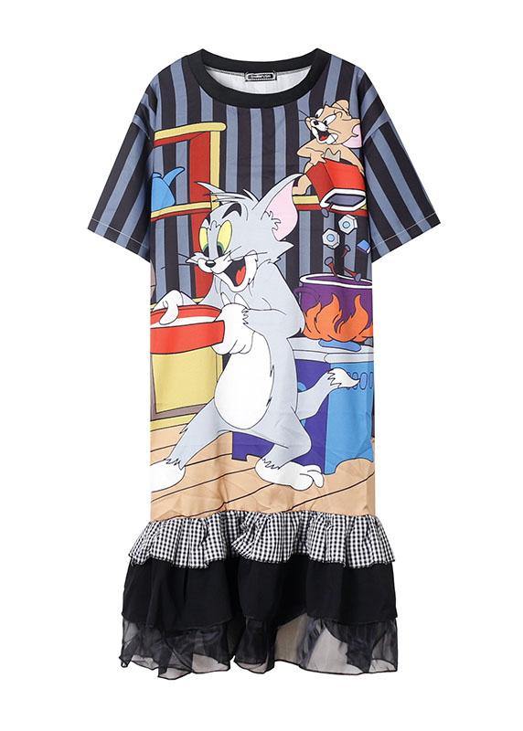 Moderne Rüschen-Baumwollkleidung Damen Runway Navy bedrucktes Maxikleid