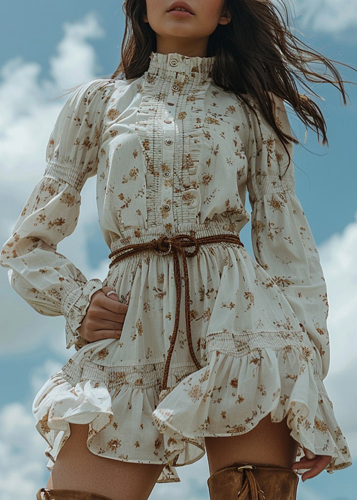 Women White Ruffled Print Patchwork Cotton Dress Long Sleeve