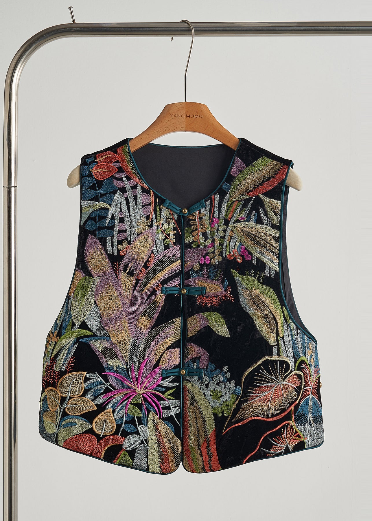 Handmade Black Embroideried Chinese Button Silk Velour Vests Fall