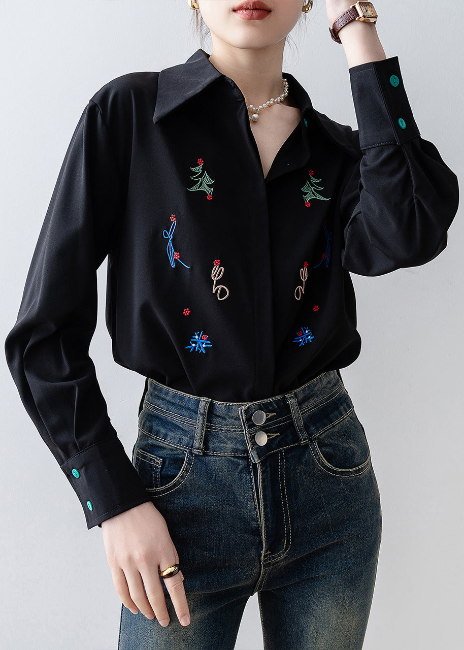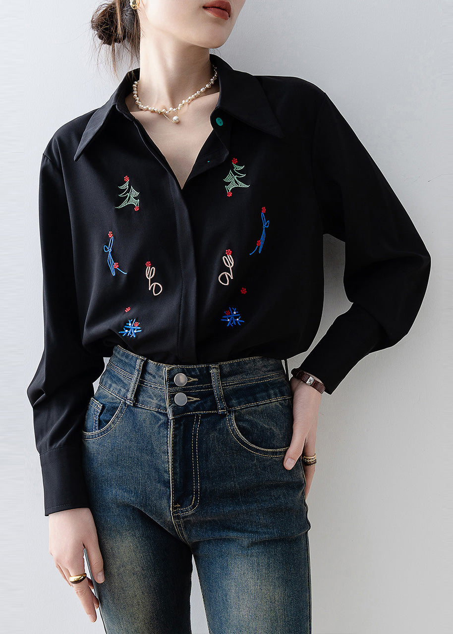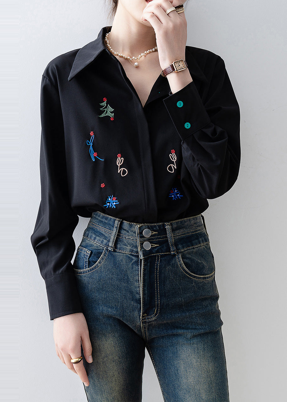 Plus Size Black Embroidered Chiffon Blouse Tops Spring