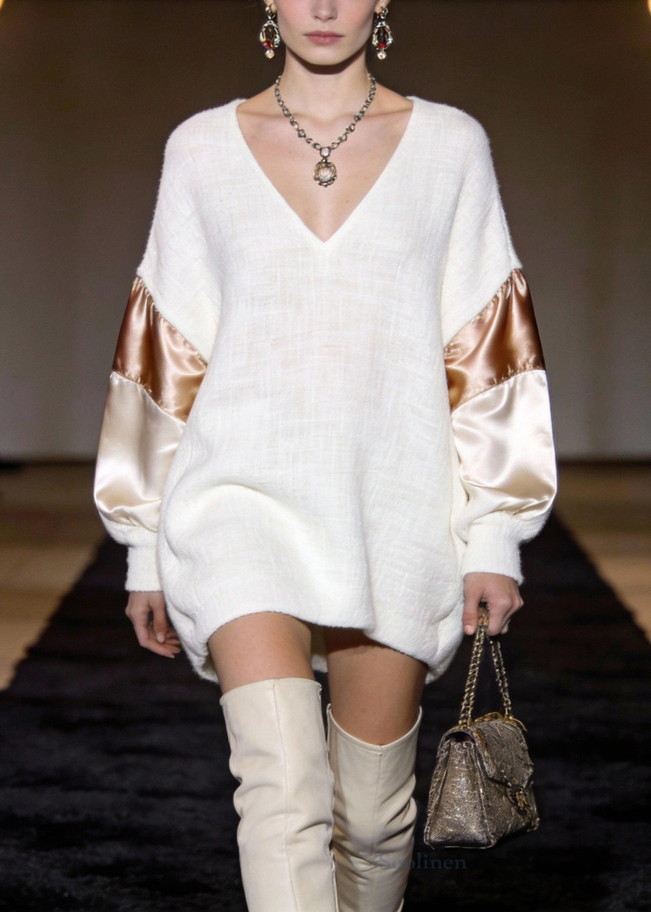Elegant White V Neck Silk Patchwork Mini Dresses Spring