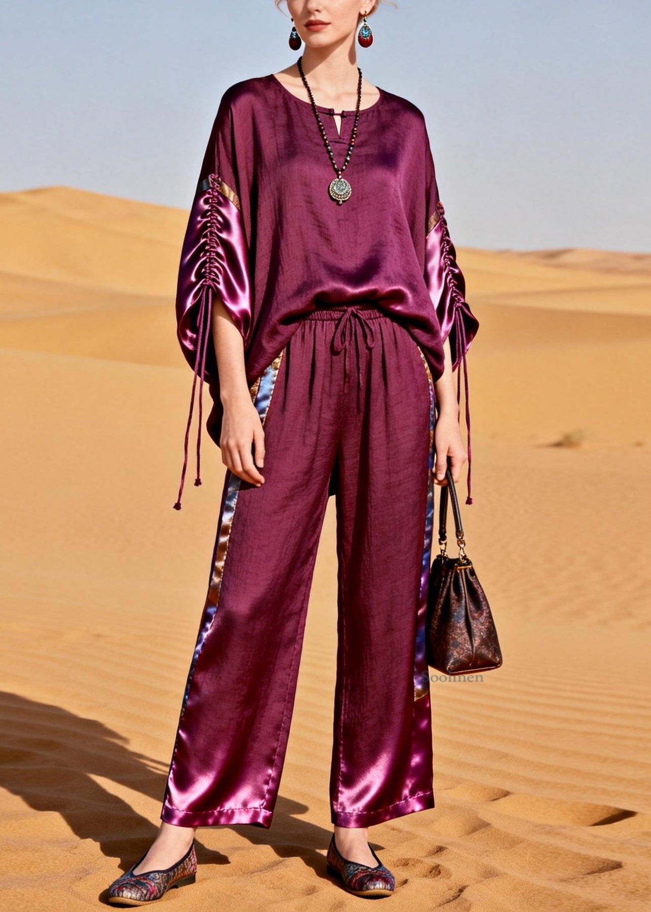 Boutique Purple Drawstring Elastic Waist Silk Patchwork Two Piece Set
