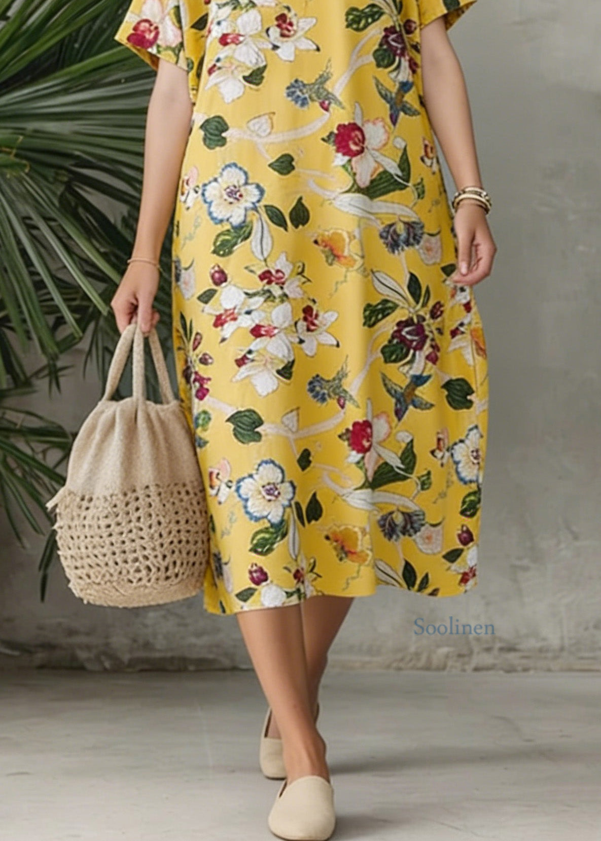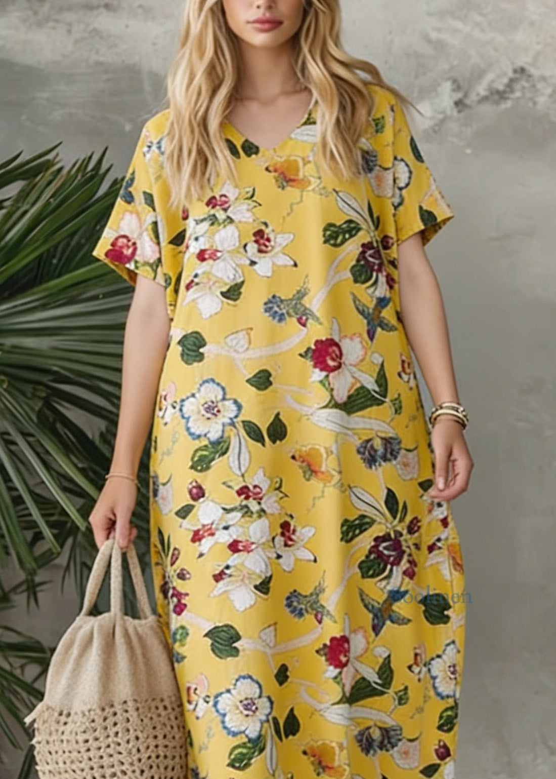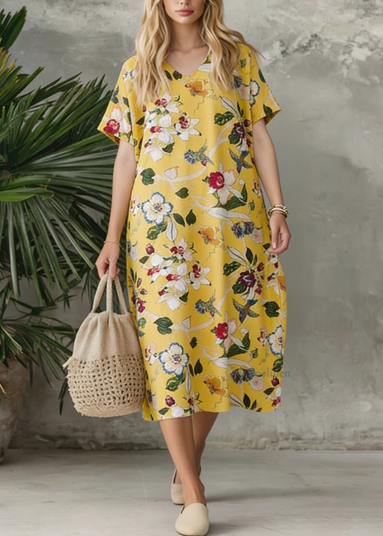 Bohemian Yellow V Neck Print Loose Cotton Dress Summer