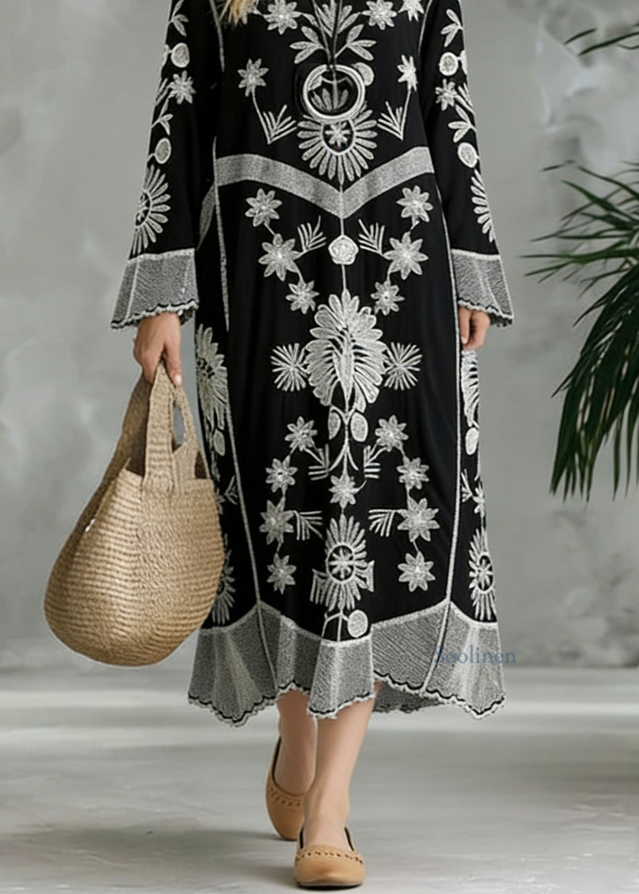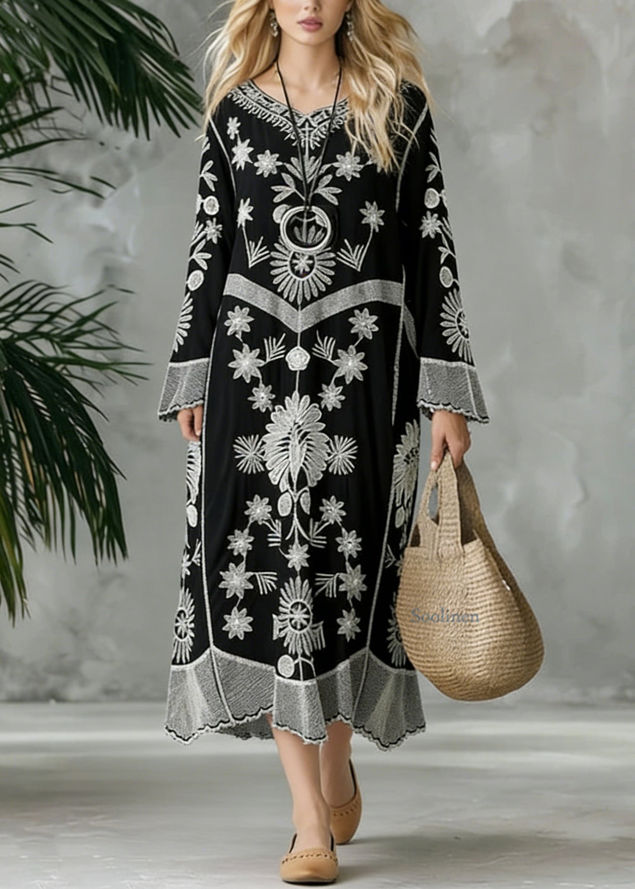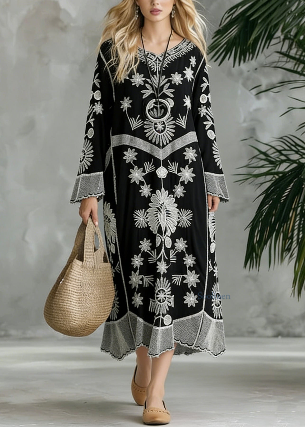 French Black Print V neck Baggy Chiffon Robes Spring Dresses