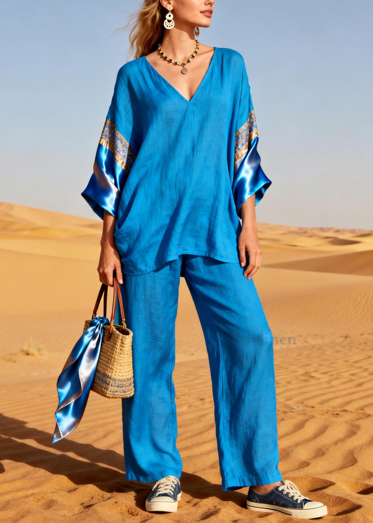 Diy Blue Oversized Patchwork Linen Silk Two Piece Set Outfits Spring