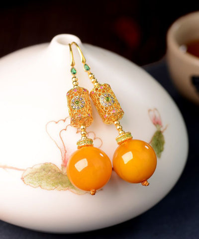 Chinese Style Gold Sterling Silver Overgild Amber Beeswax Drop Earrings
