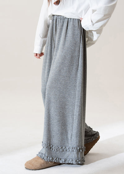 Women Grey Ruffled Elastic Waist Patchwork Cotton Wide Leg Pants Fall