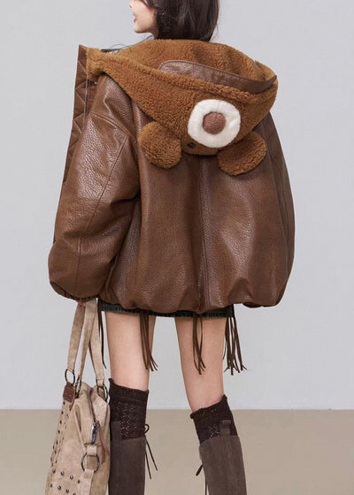 Plus Size Brown Hooded Pockets Fluffy Faux Leather Winter