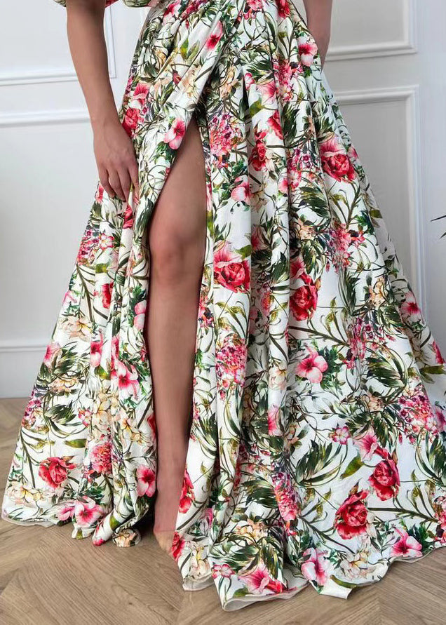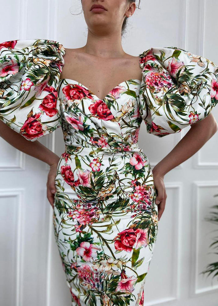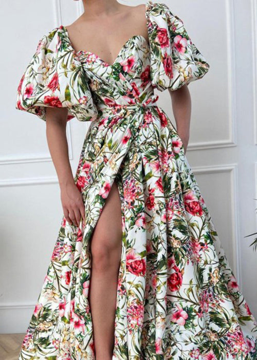 French Print Side Open Cotton Long Dress Puff Sleeve