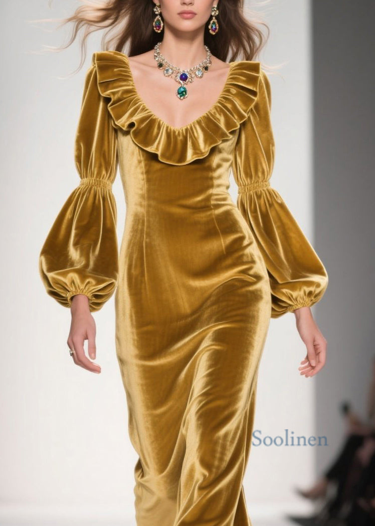 Original Design Yellow Ruffled Patchwork Velvet Long Dress Fall