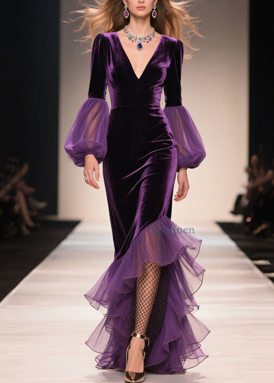 Elegant Purple V Neck Ruffled Patchwork Velvet Maxi Dresses Fall