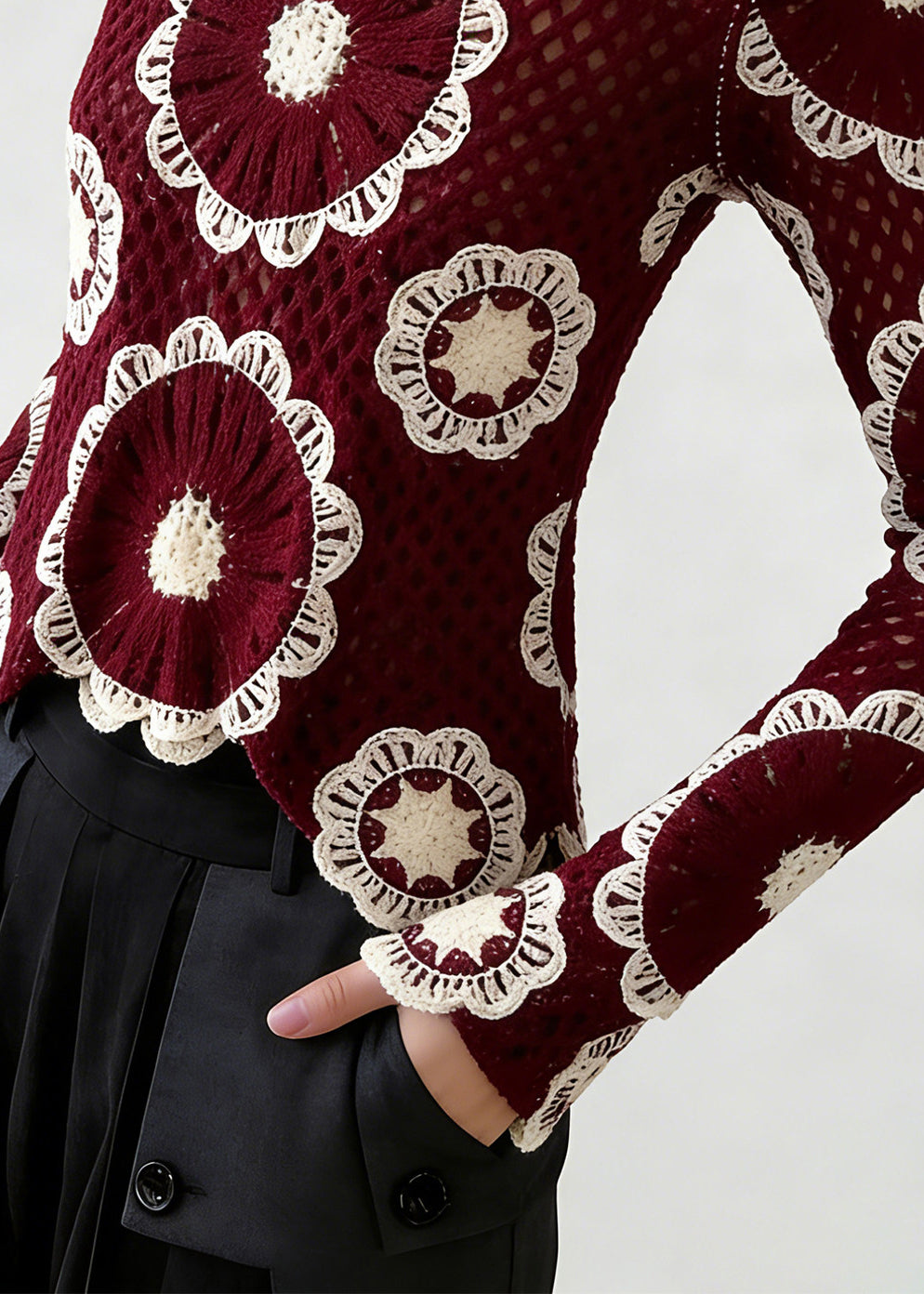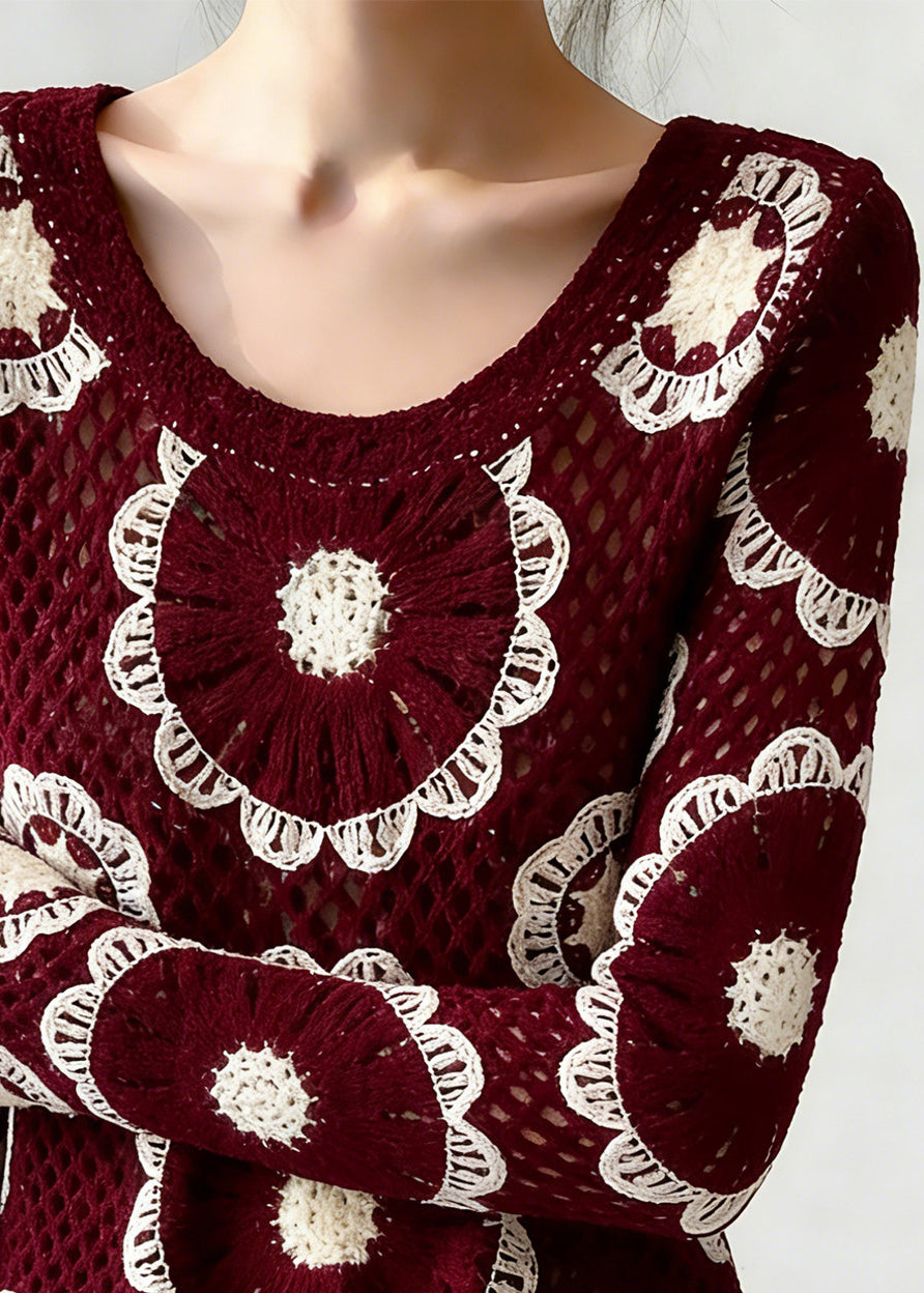 Boho Red O-Neck Hollow Out Knit Top Spring