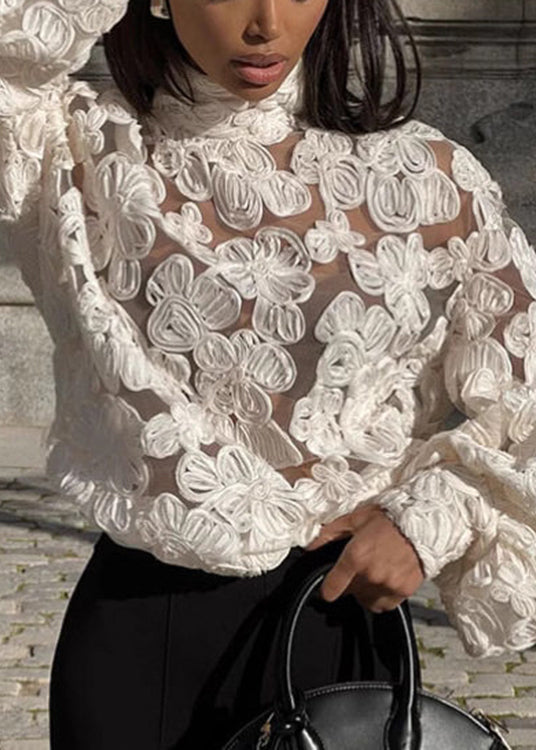 Chic White Notched Floral Lace Top Lantern Sleeve