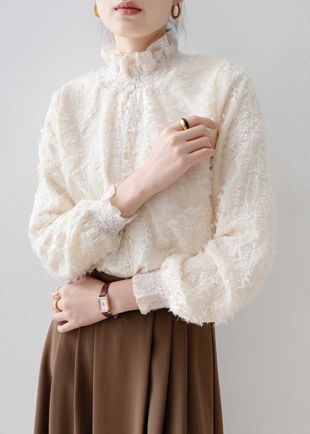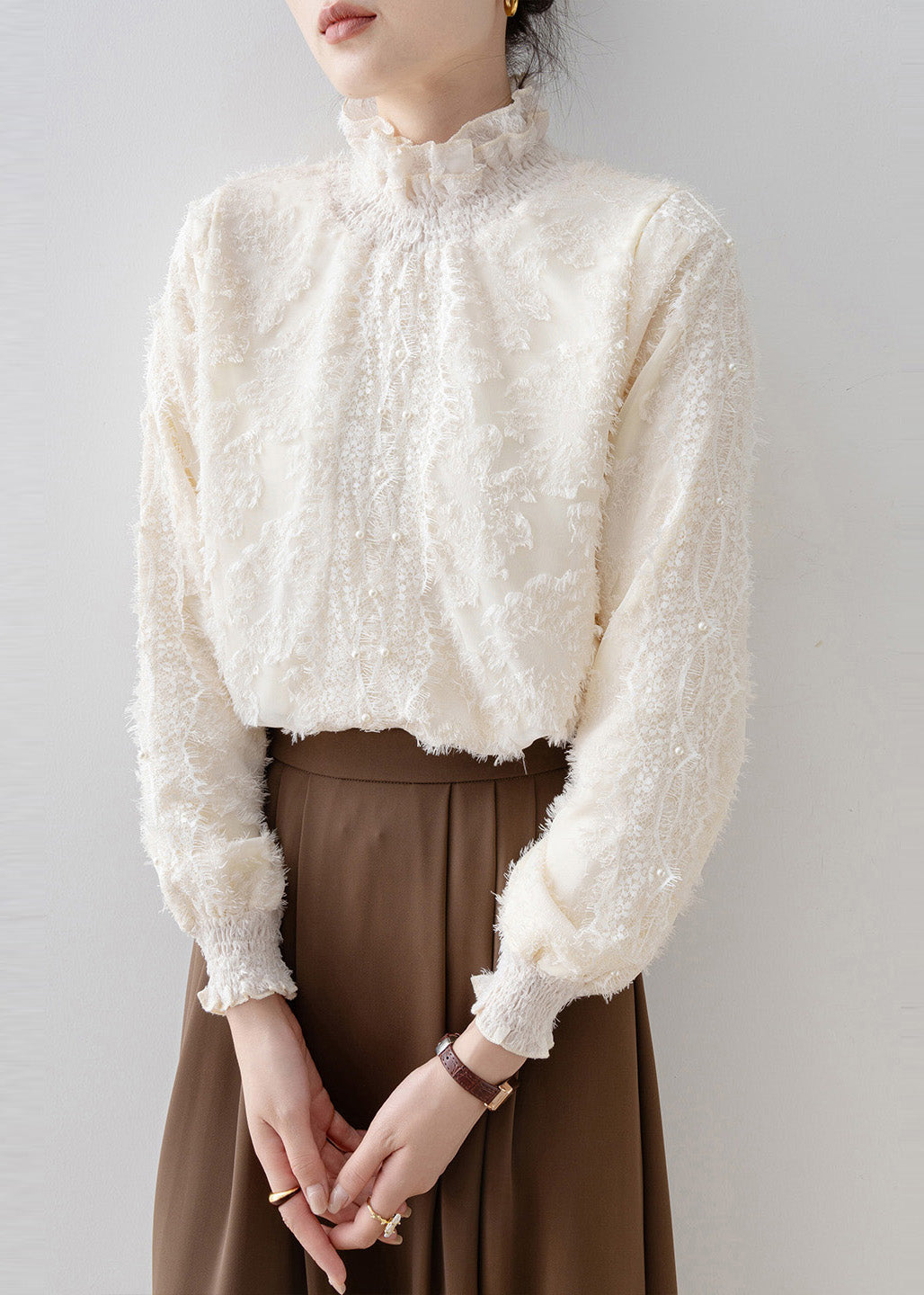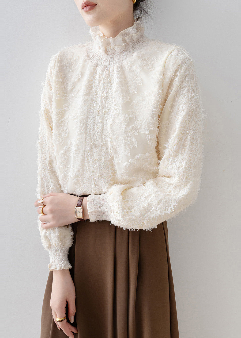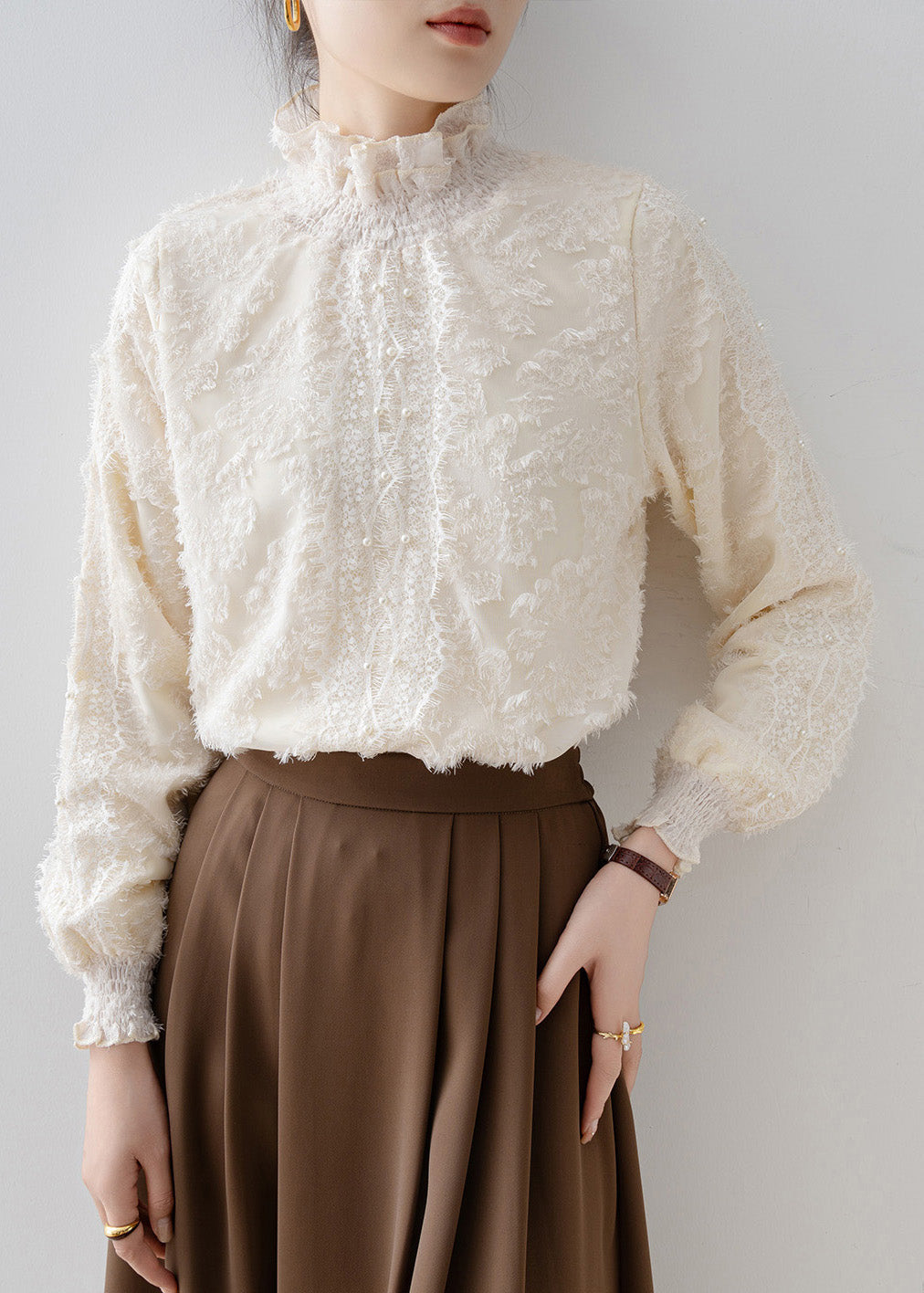 Fashion Beige Stand Collar Warm Fleece Blouse Tops Winter