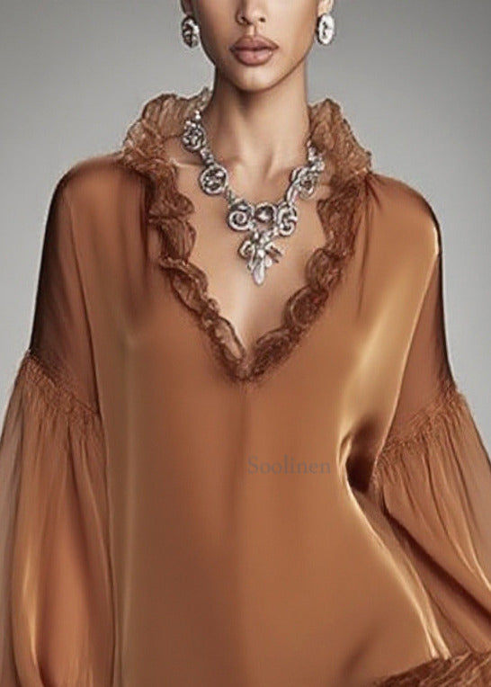 French Brown Ruffles Patchwork Chiffon Mid Dress Spring