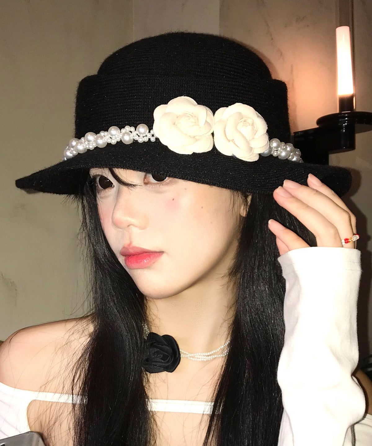 Elegant Black Pearl Floral Knit Cloche Hat