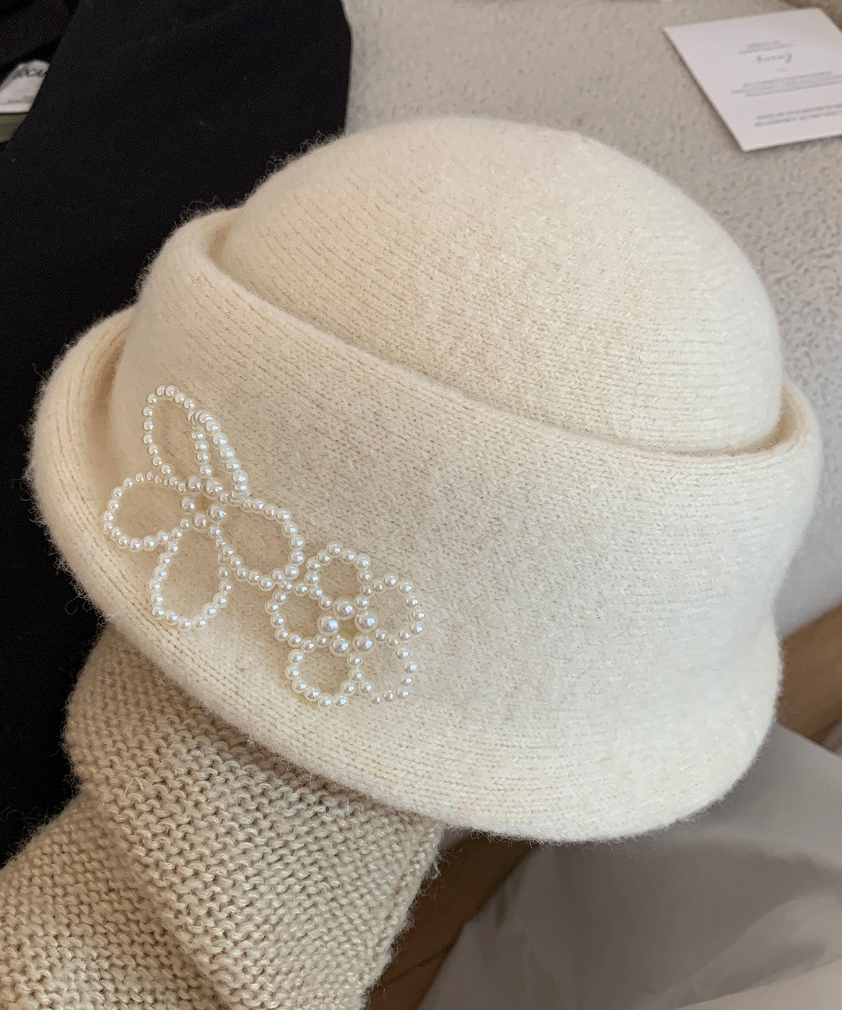 French Elegant Black Pearl Knit Bucket Hat