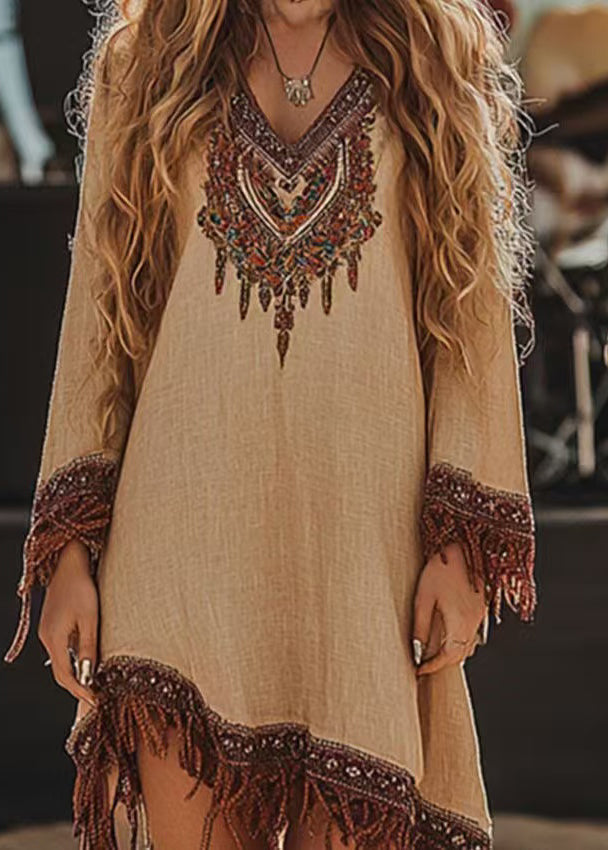Style Blue Tasseled Print Cotton Holiday Dress Spring