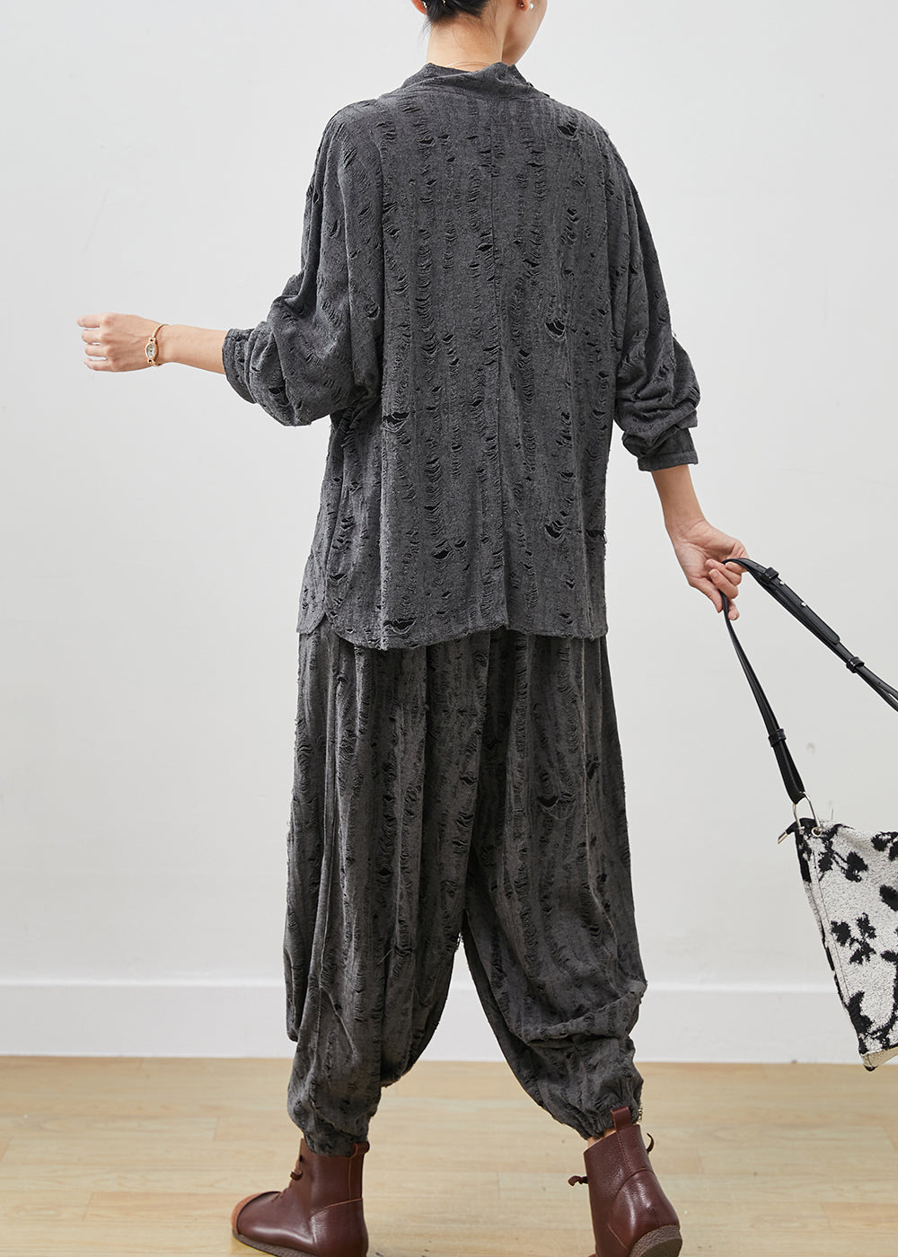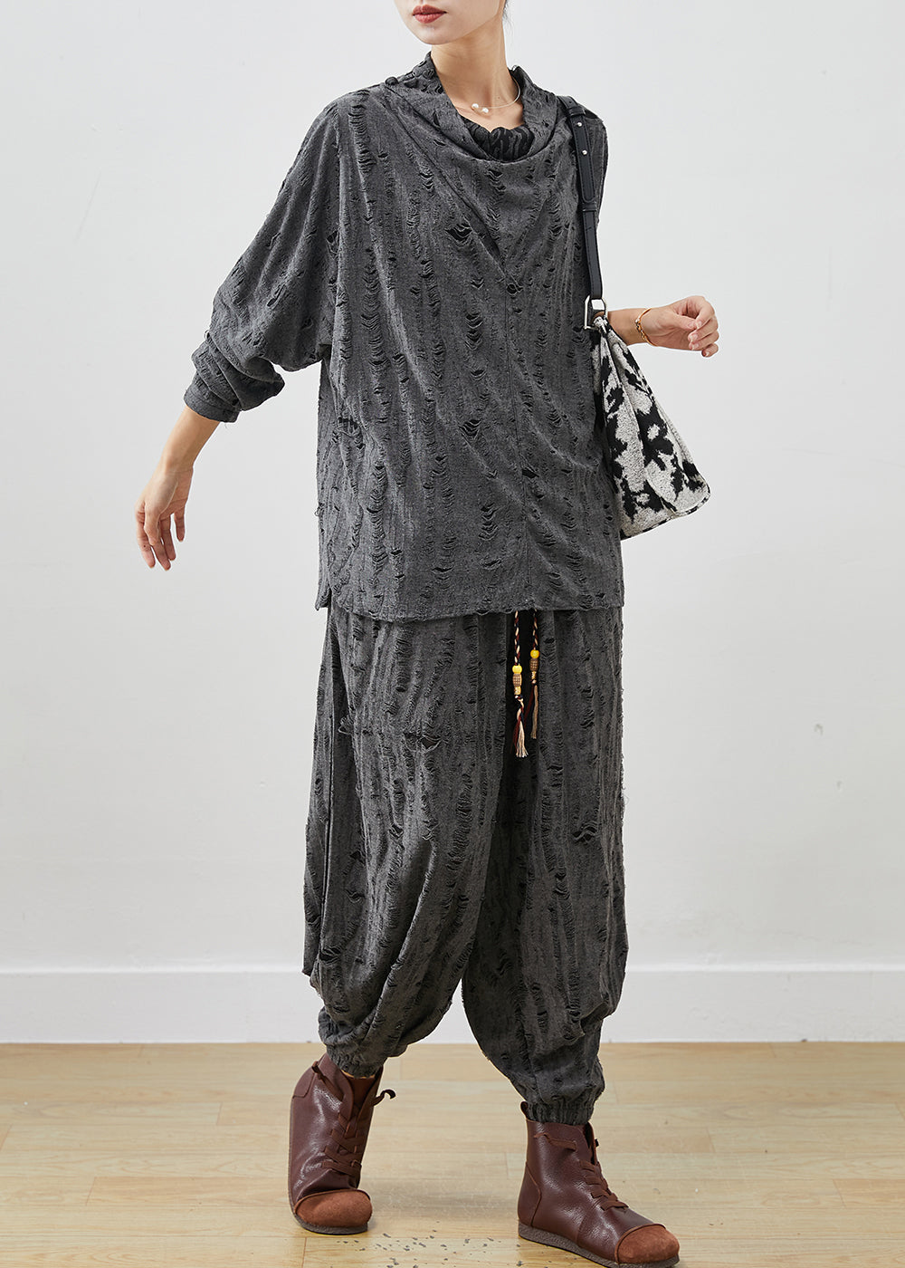 Casual Grey Turtle Neck Cotton Ripped Two Pieces Set Spring