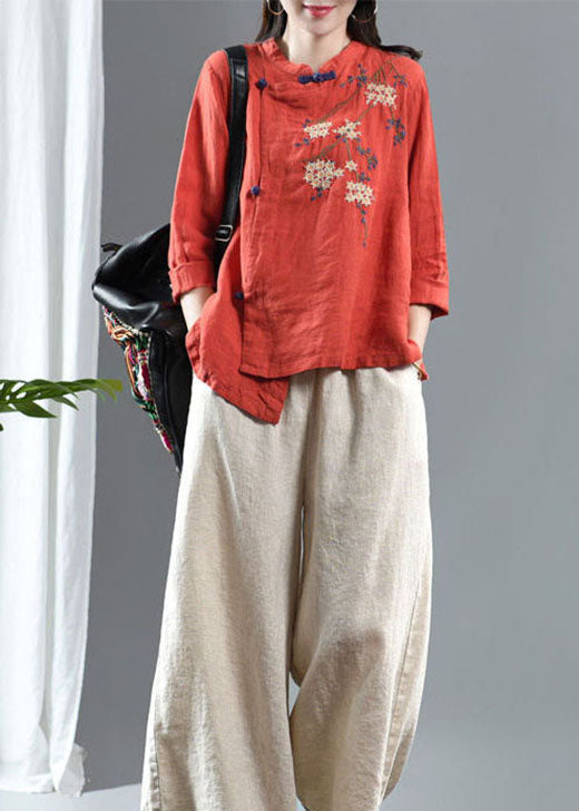 Lockeres, orangefarbenes, geblümtes Leinenoberteil mit halben Ärmeln