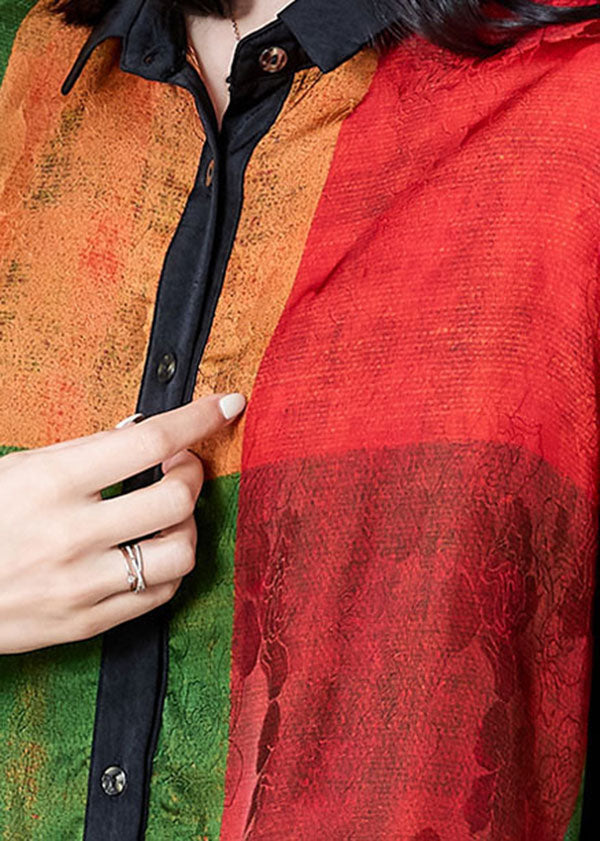 Art Red Peter Pan Collar Print Patchwork Silk Shirt Tops Summer