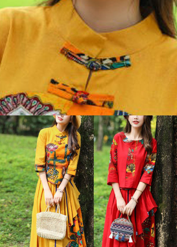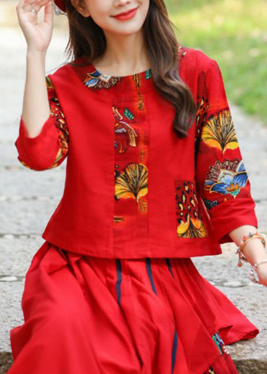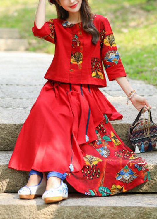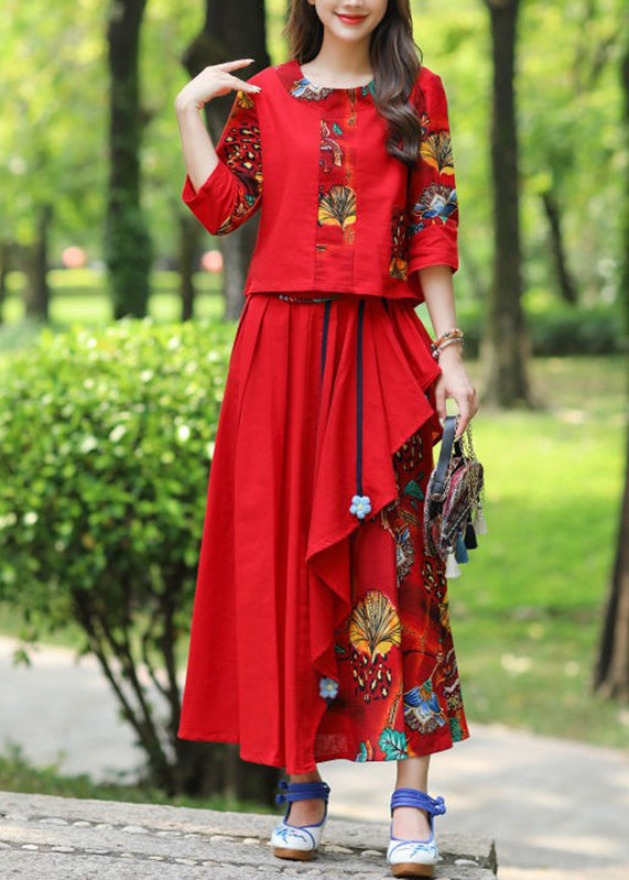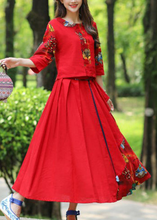 Red O-Neck Button Top And Skirts Two Piece Set Fall