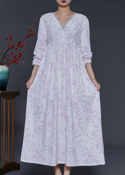 Bohemian Light Purple V Neck Print Cotton Ankle Dress Spring