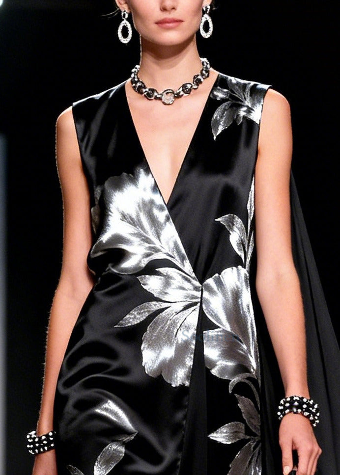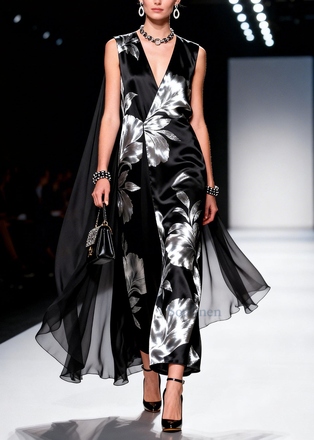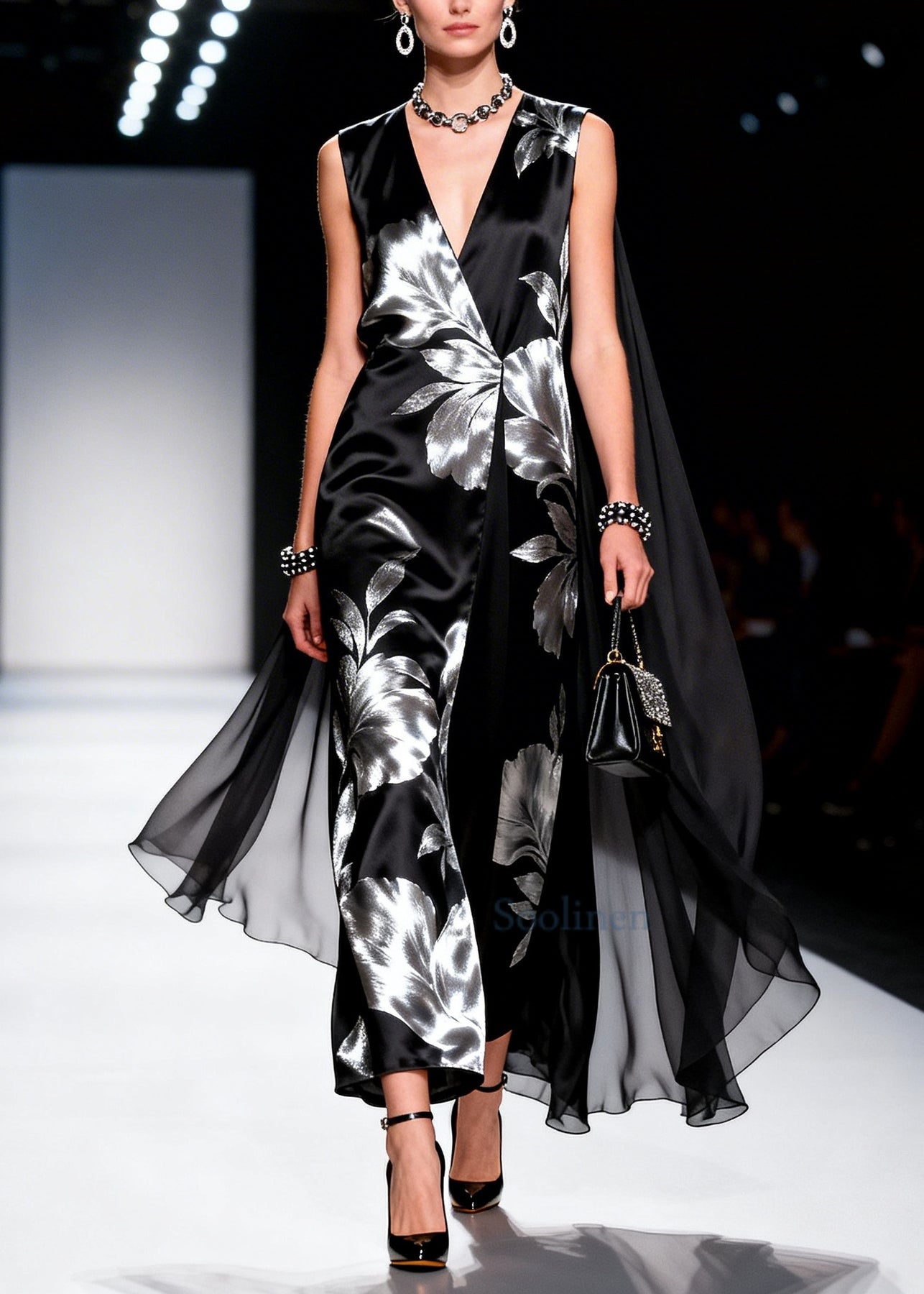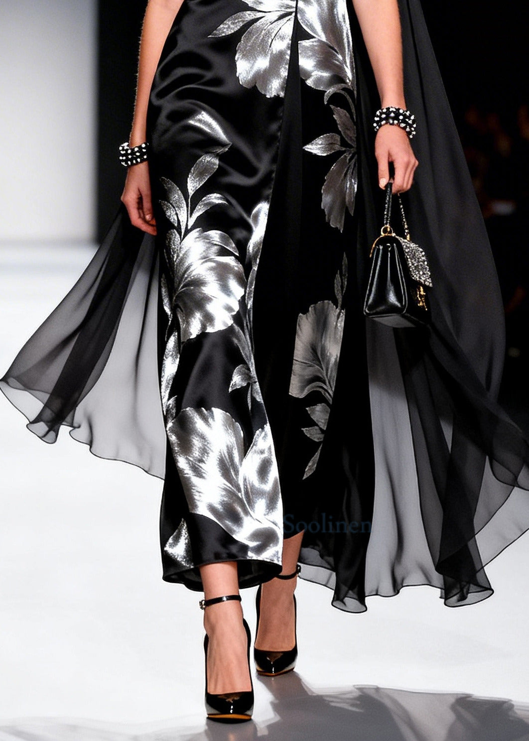 Elegant Black Jacquard Patchwork Shawl Silk Party Dress Summer