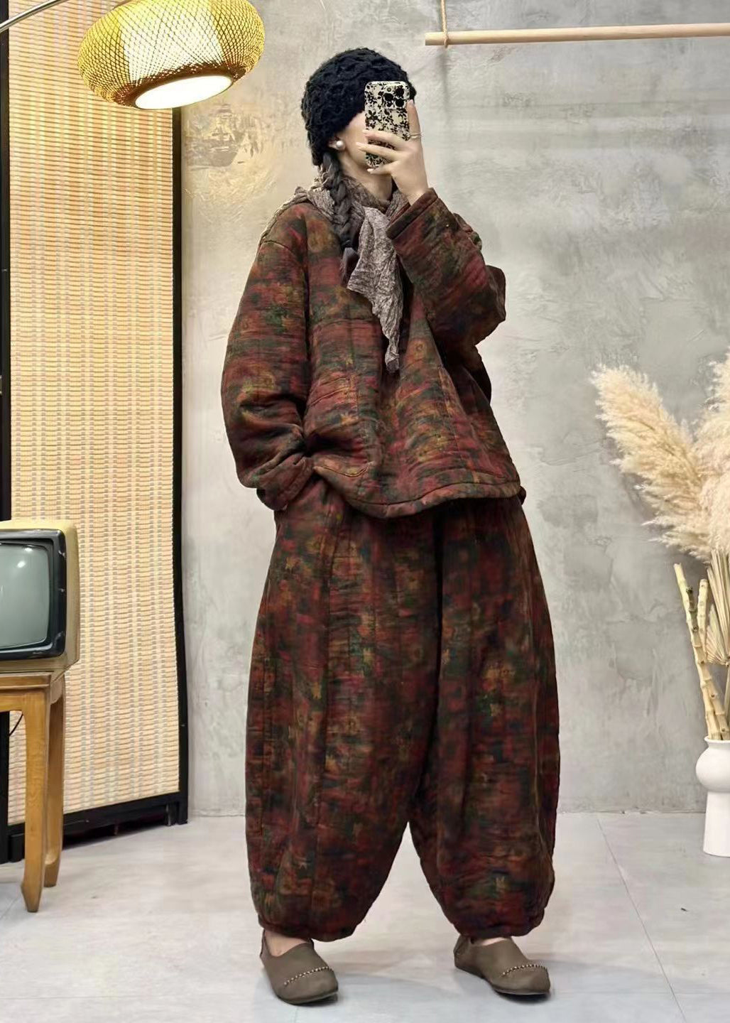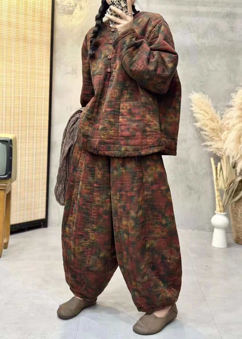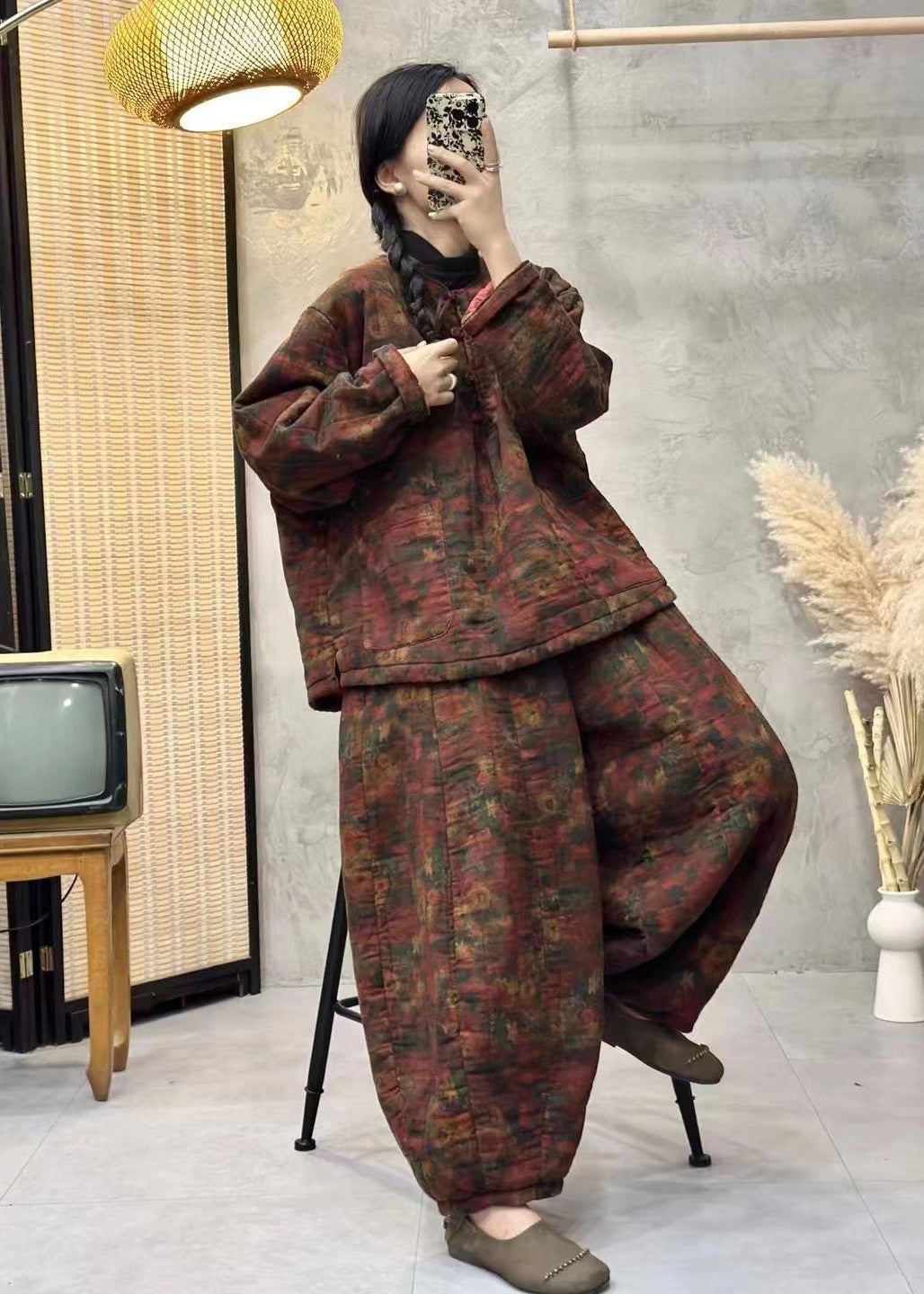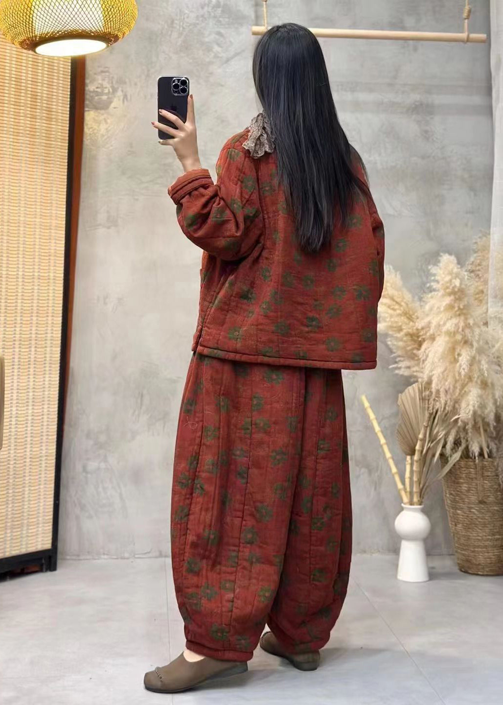 Vintage Orange Print Tops And Pants Fine Cotton Filled Two Pieces Set Spring