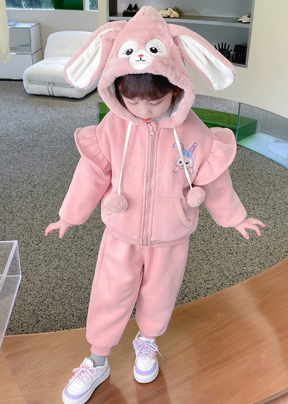 Pink Pockets Patchwork Warm Fleece Girls Two Pieces Set Ruffled Long Sleeve