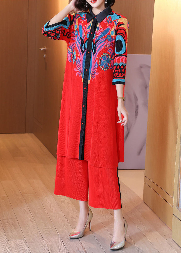 Red Patchwork Two Pieces Set Peter Pan Collar Side Open Summer