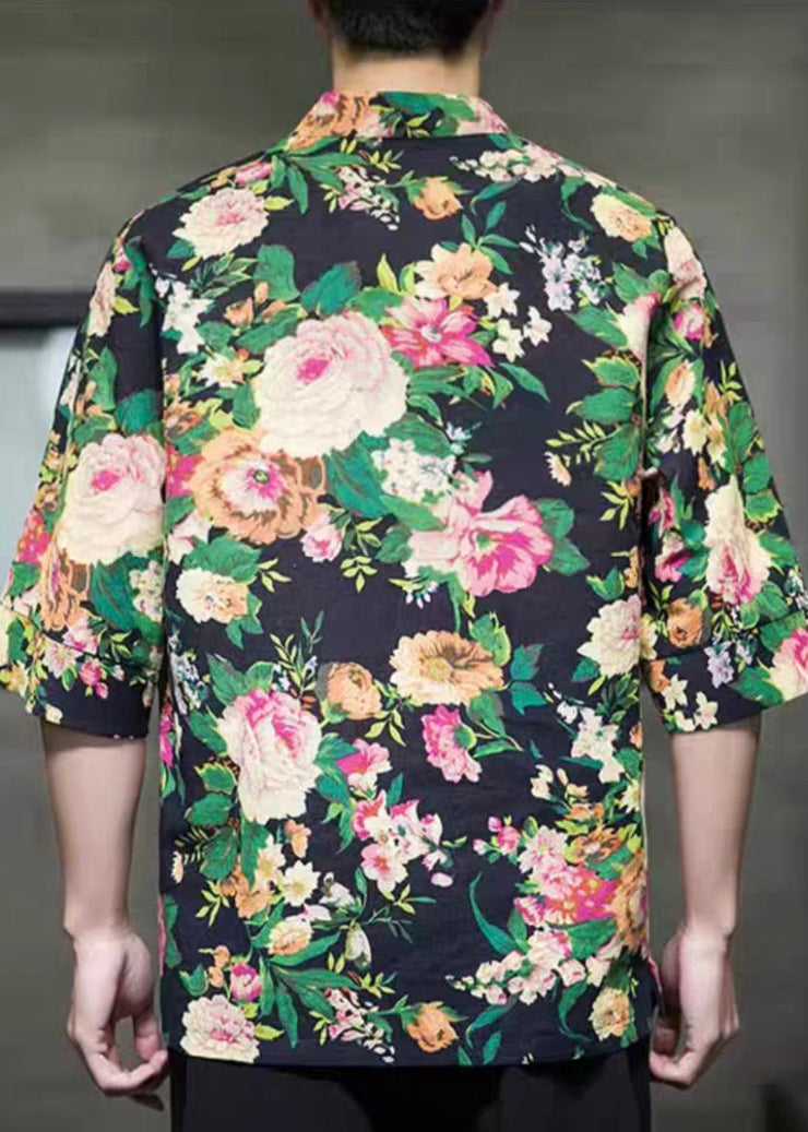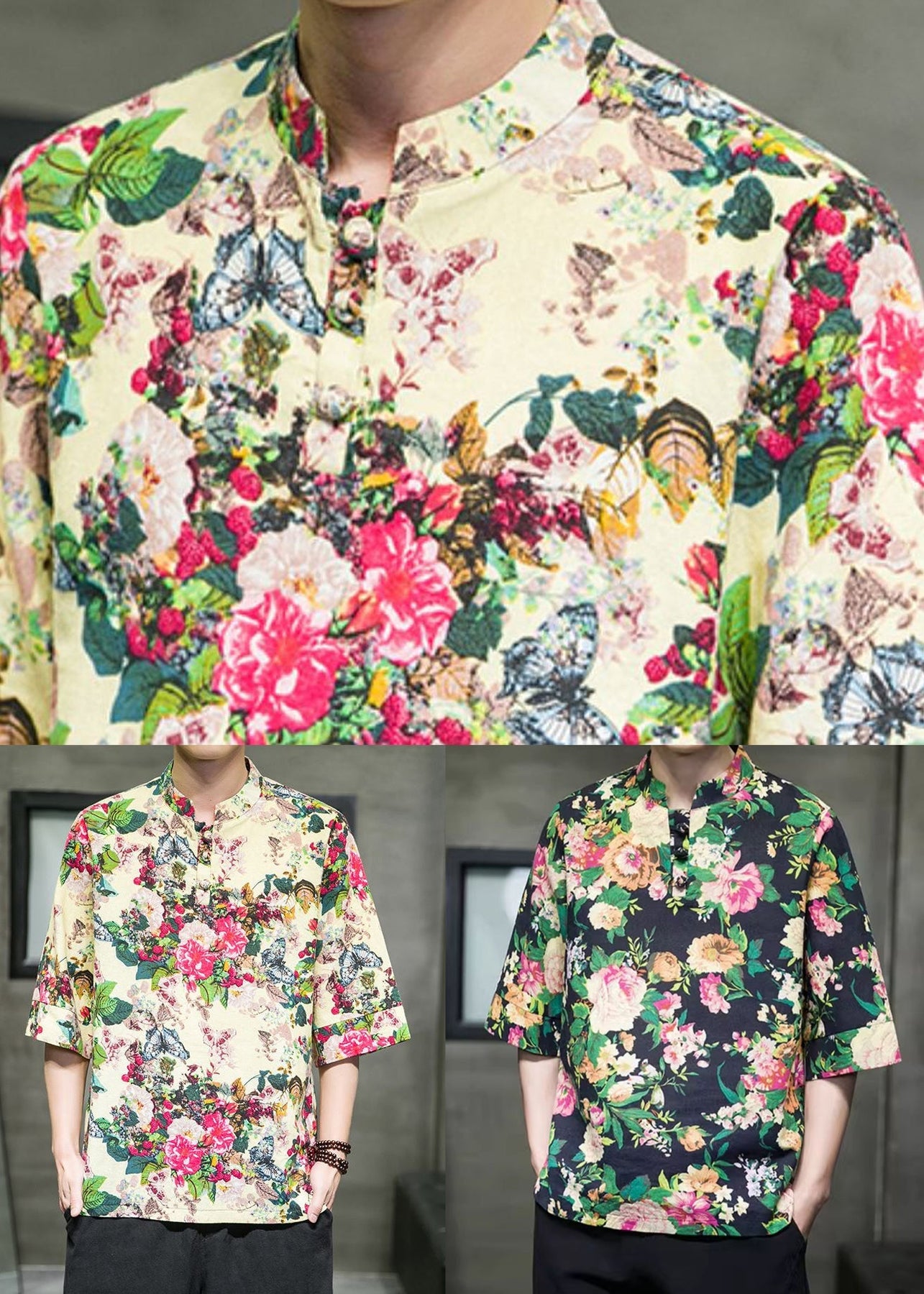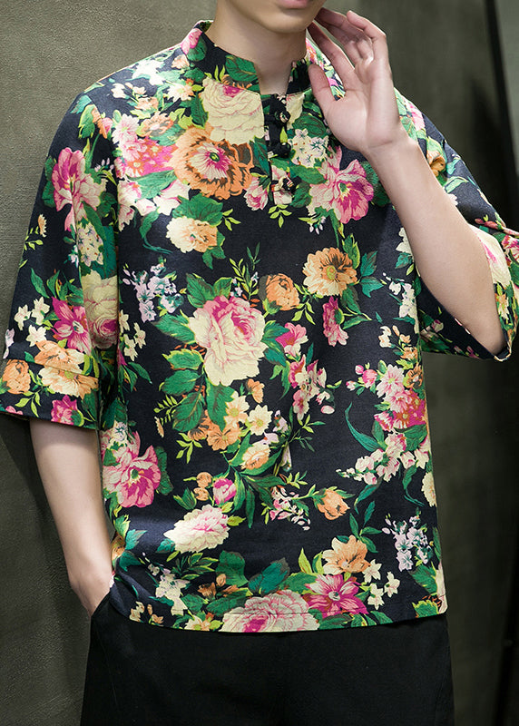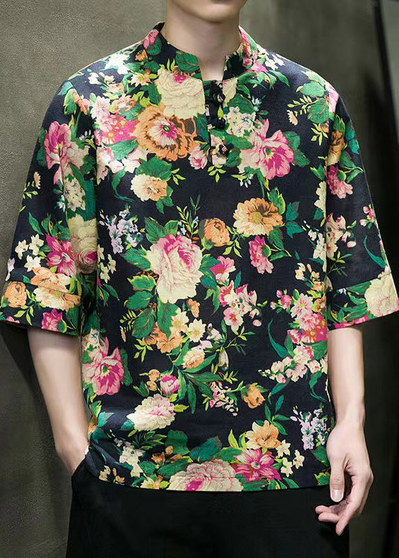 Loose Black Stand Collar Print Cotton Mens Tees Summer