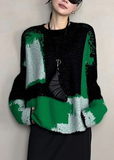 French Blackish Green O Neck Cozy Patchwork Knit Sweaters Winter